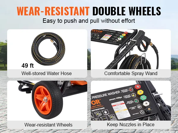 Gemakkelijk te verplaatsen: onze benzinehogedrukreiniger bestaat uit een stevig stalen frame met een slijtvaste hogedrukwaterslang van ca. 8 meter lang. Alle accessoires zijn handig opgeborgen op de machine, zodat je niet bang hoeft te zijn dat je onderdelen kwijtraakt. Het gebruik van deze machine maakt uw schoonmaakwerkzaamheden eenvoudiger en gemakkelijker.
