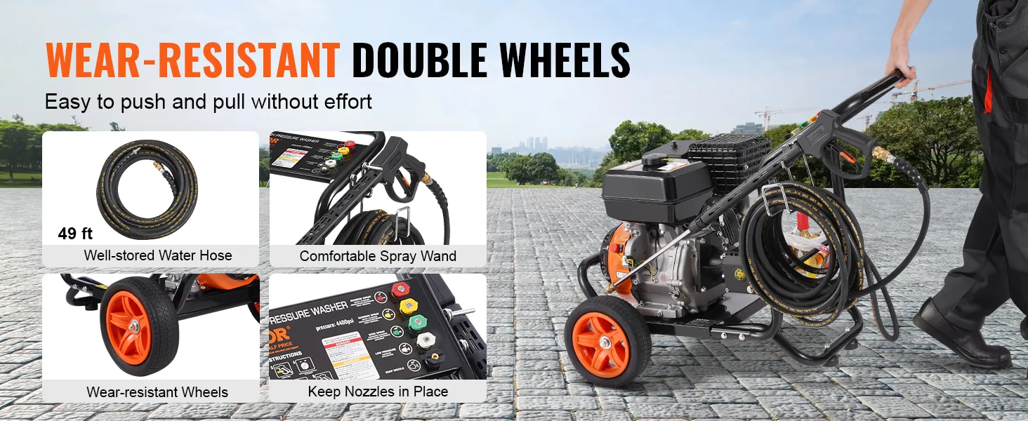 Deze benzinemotorreiniger wordt geleverd met een stevig metalen karretje met twee wielen en een zacht handvat voor gemakkelijke mobiliteit.