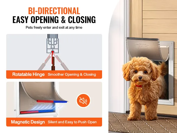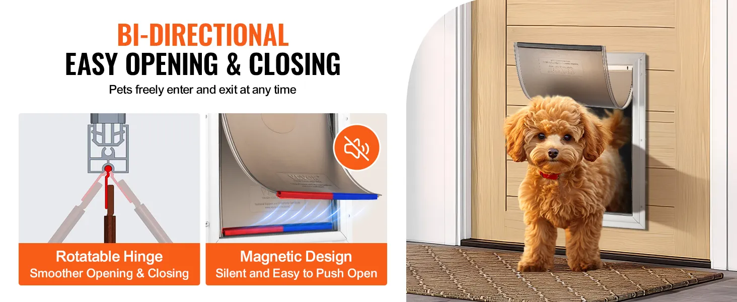 The unique hinge design allows the pet door for dog to rotate at a wide angle, so your pet can pass through effortlessly. The magnetic seal opens with a gentle push, giving your pet easy access and the freedom to move in and out with ease.