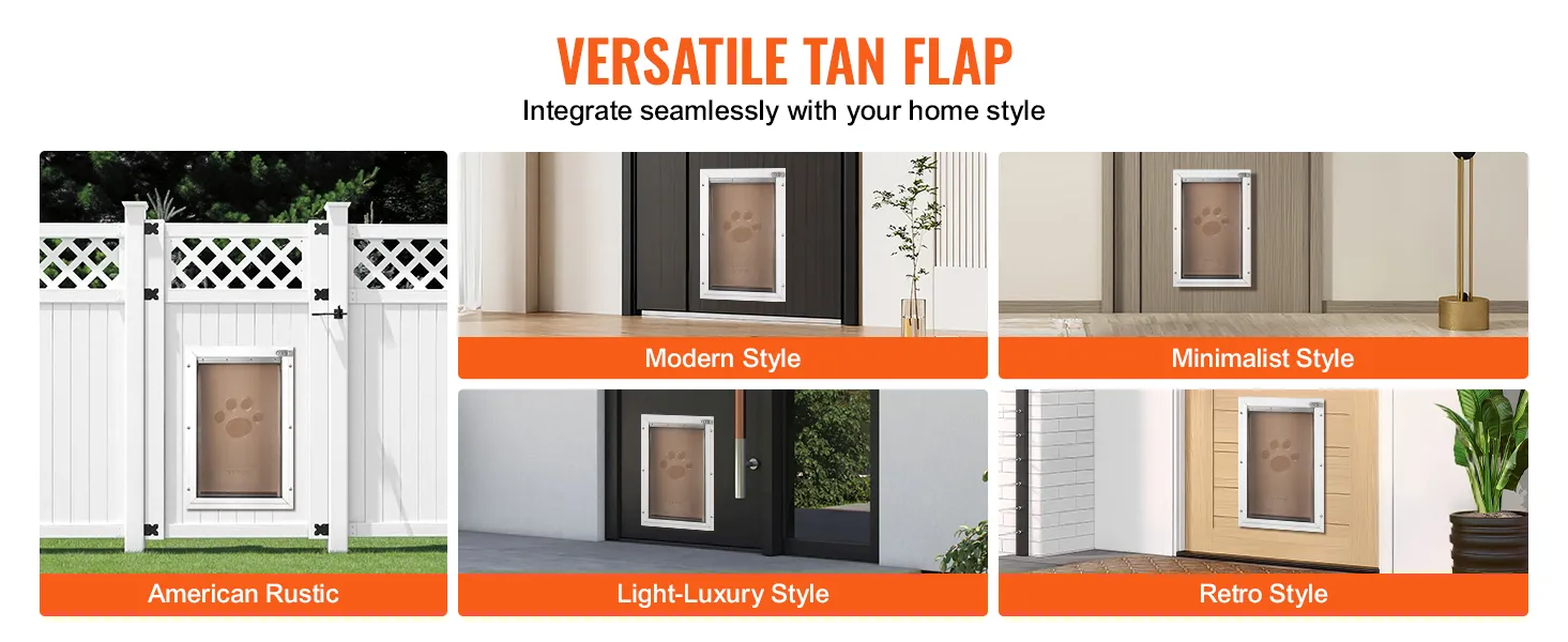 Sleek & Modern Design: The minimalist white aluminum frame combined with the tawny door flaps adds a stylish touch, seamlessly complementing any home decor. This pet door fits ideally in any household, offering your home both functionality and elegance.