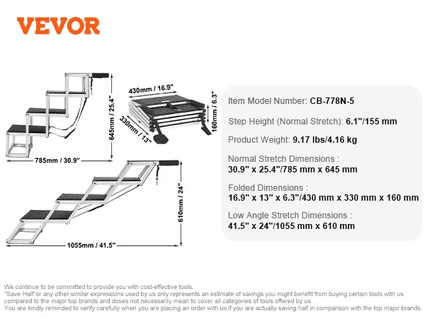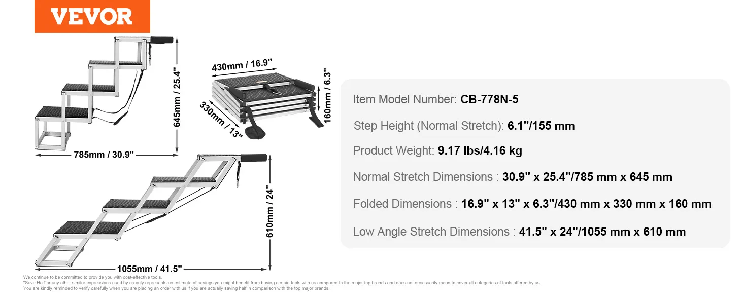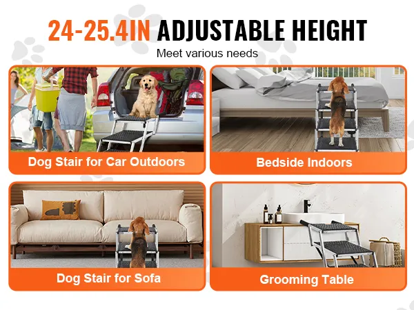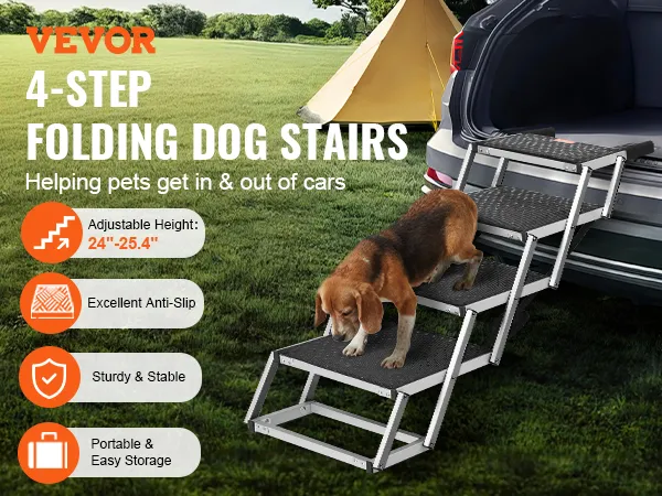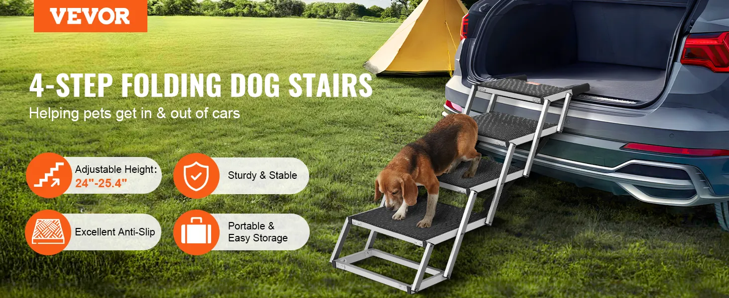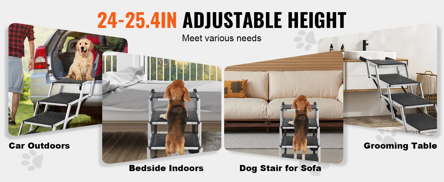 De VEVOR hondentrap voor auto's is ontworpen met het gemak van uw huisdier in gedachten. De 4-traps opvouwbare hondentrappen variëren van 24-25,4 inch, waardoor ze ideaal zijn voor kleine honden, oudere huisdieren of gewonde huisdieren om gemakkelijk toegang te krijgen tot autokoffers, zijdeuren, SUV's, kleine busjes, vrachtwagens, bedden, banken, verzorgings- of dierenartstafels. Deze functie zorgt ervoor dat uw huisdier zonder problemen of ongemak in en uit de auto of andere verhoogde oppervlakken kan klimmen. Bovendien zorgt de verstelbare hoogte ervoor dat de treden altijd in de perfecte hoek voor uw huisdier staan, waardoor het voor hen gemakkelijker is om te klimmen.