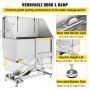 The X-shaped electric lift is for adjusting height, the sliding door for smoothly opening and closing, the foldable ramp for easy storage and moving, and the rubber feet for keeping stable.