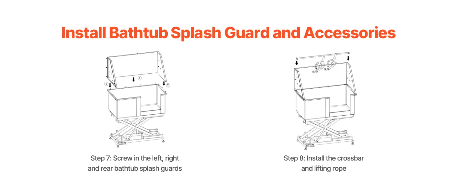 Integrated Design: The rounded seamless welding provides better sealing and makes cleaning more convenient. The dog grooming tub is featuring hot and cold faucets, a dual-control showerhead, and a soap holder, this design simplifies and streamlines the bathing process. The PE water filter board provides a non-slip draining surface, and the included duckbill buckle stops pets from accidentally triggering the door during bath time, keeping them securely inside