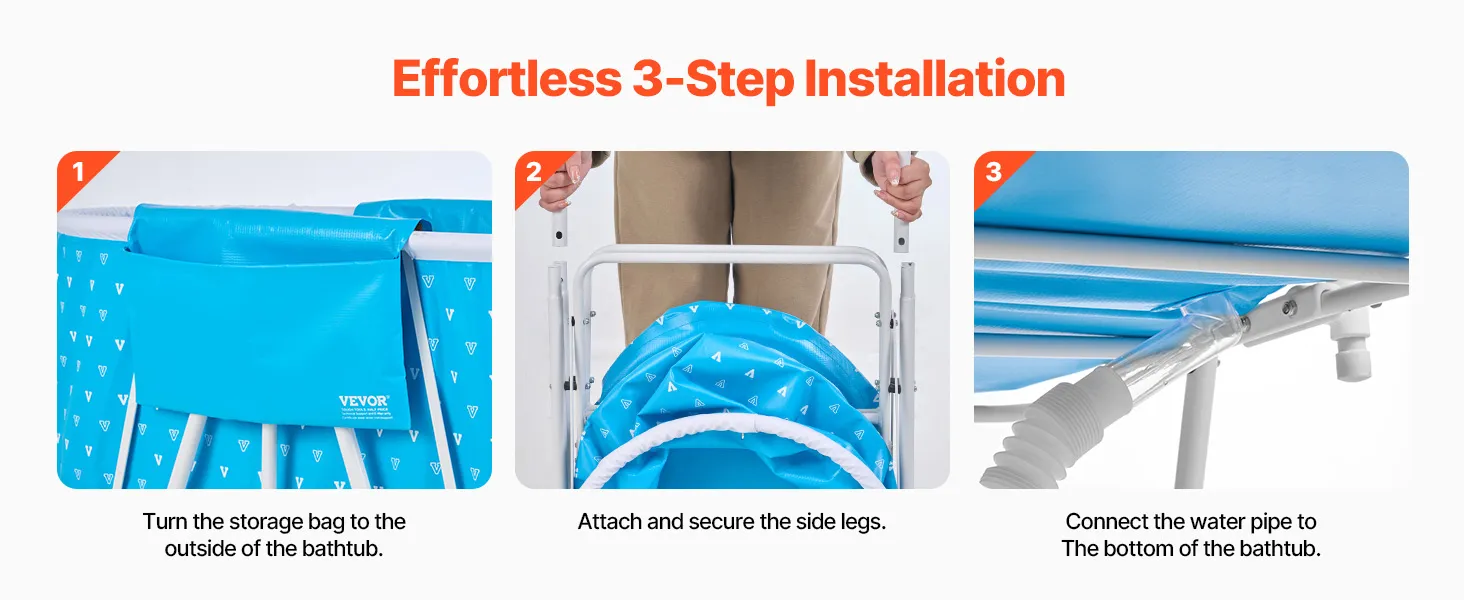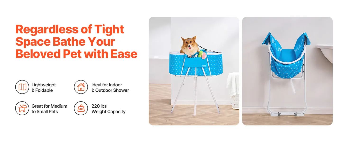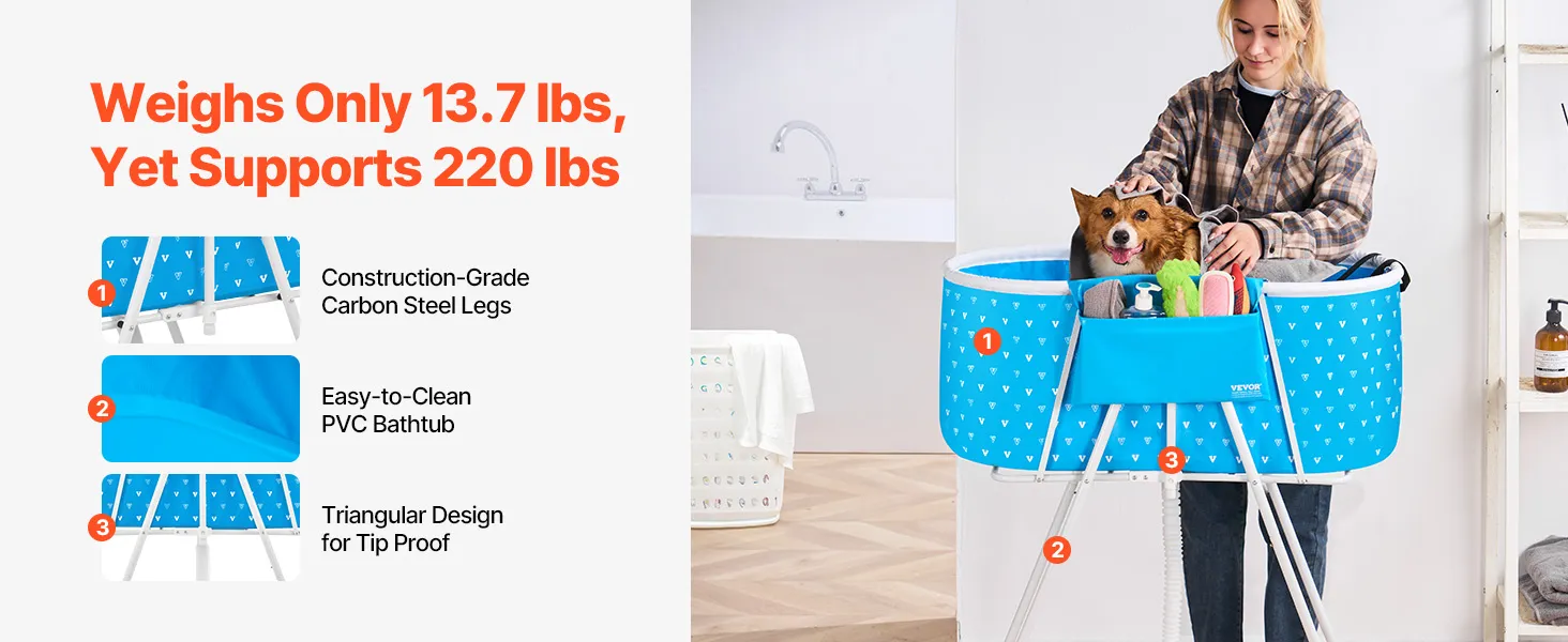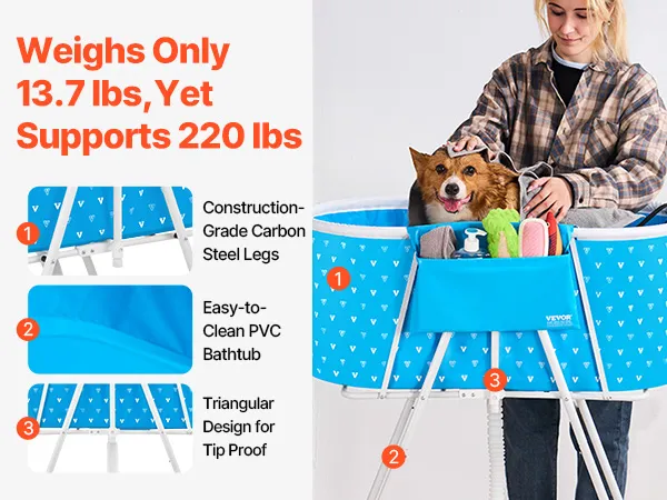 Sturdy & Built-to-Last Design: With a weight capacity of up to 220 lbs, this bath tub can easily support small and medium-sized dogs and cats, along with bath water and grooming supplies. You won’t have to worry about tipping or instability during use. Its triangular structure and heavy-duty carbon steel legs provide a solid base for both you and your pet’s security, while the PVC material is both collapsible and easy to clean.