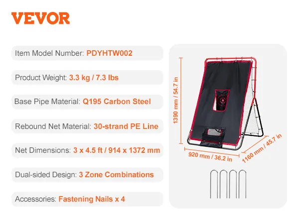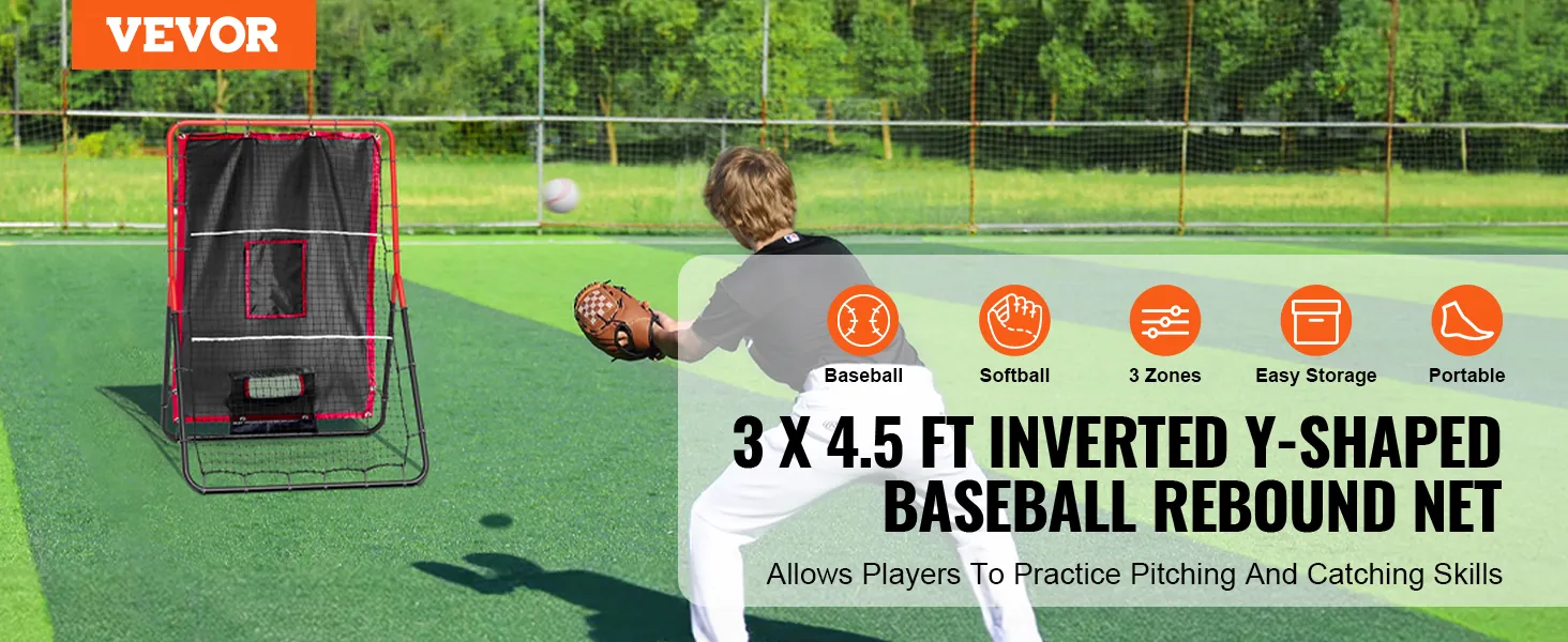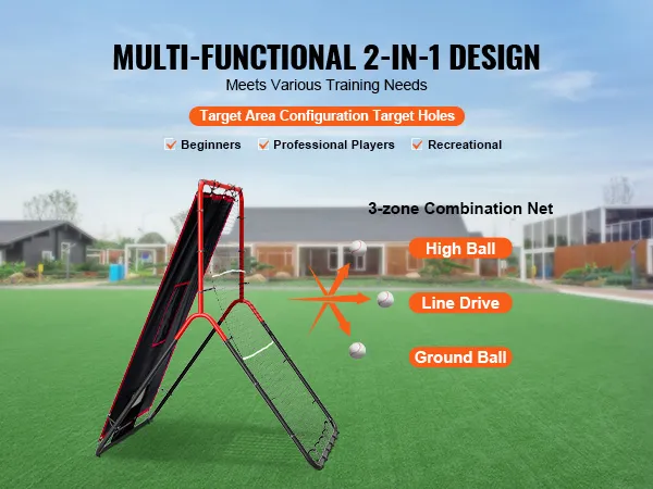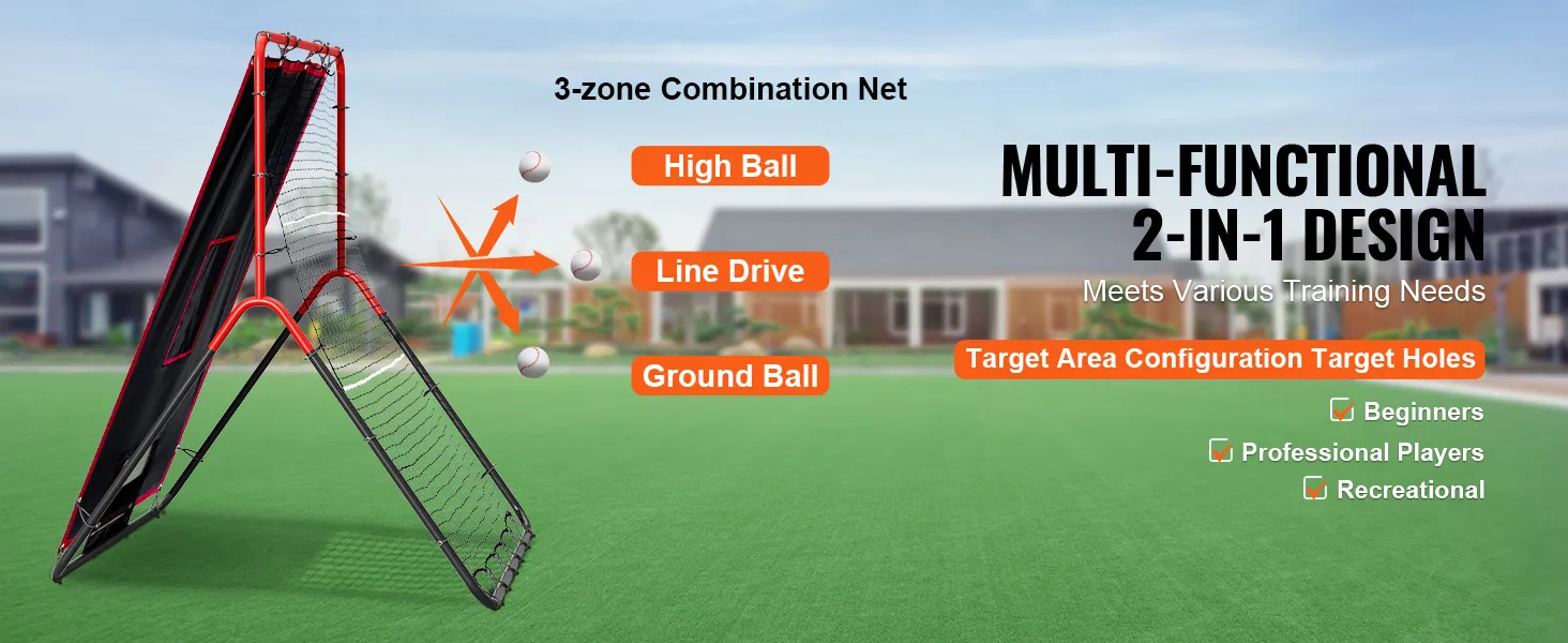 Combination-Type Net Design: A 3 x 4.5 ft baseball rebound net with a combination-type net design featuring 3 zones with varying rebound angles, enhancing randomness in ball return. Designed for baseball and softball, suitable for beginners, professional players, and recreational games.