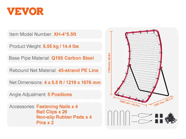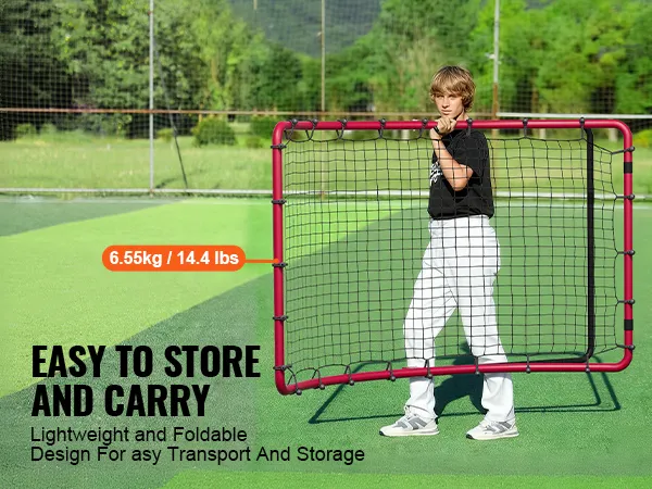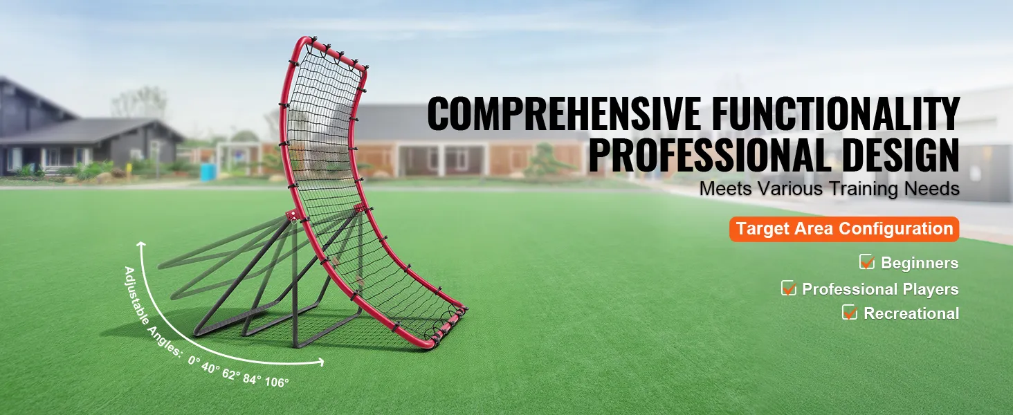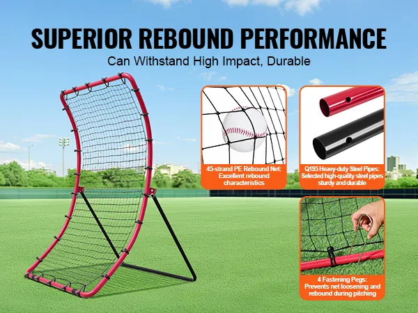 Gebogen netontwerp: een honkbal-reboundnet van 4 x 5,5 ft (1219 x 1676 mm) met een gebogen netontwerp dat verschillende rebound-hoeken in verschillende gebieden biedt om de willekeur van balretouren te vergroten. Ontworpen voor honkbal en softbal, geschikt voor beginners, professionals en recreatieve spelers.