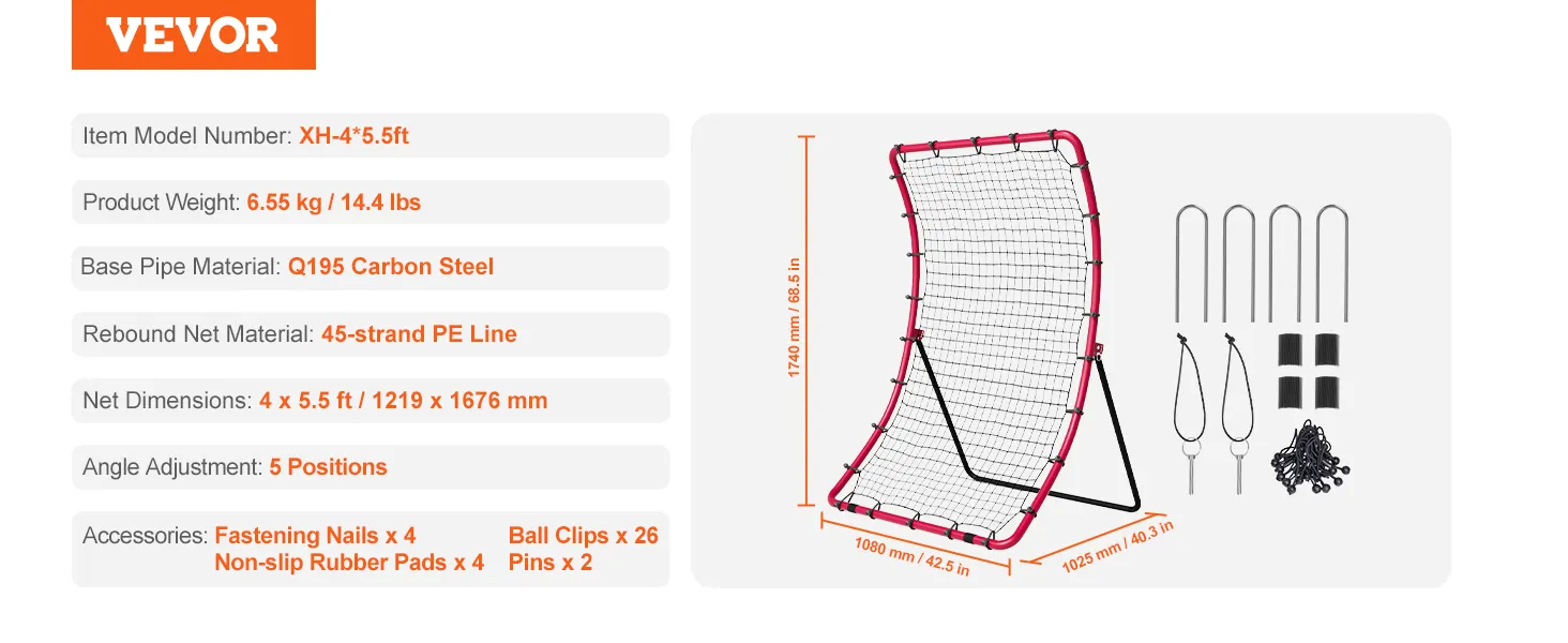 Volledig uitgerust: het honkbalnet heeft 5 verstelbare hoeken (0°, 40°, 62°, 84°, 106°) en doelbereikinstellingen en is uitgerust met een 45-strengs PE-reboundnet met hoge dichtheid voor uitstekende rebound-prestaties. Hiermee kun je vang- en werptechnieken vanuit verschillende hoeken oefenen, waaronder hoge ballen, line drives en grounders.