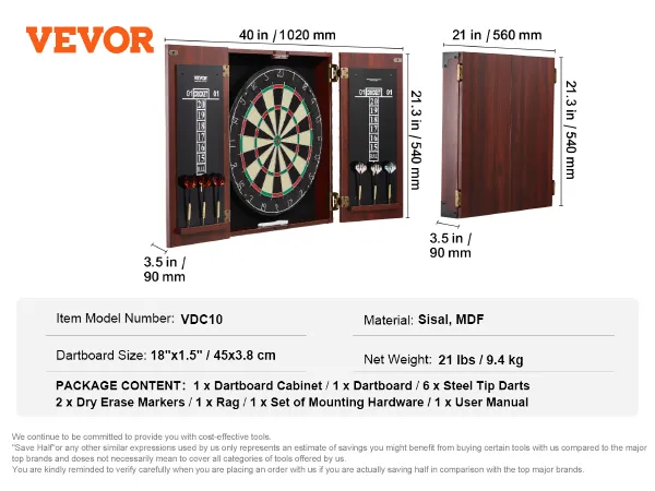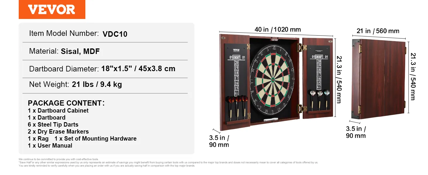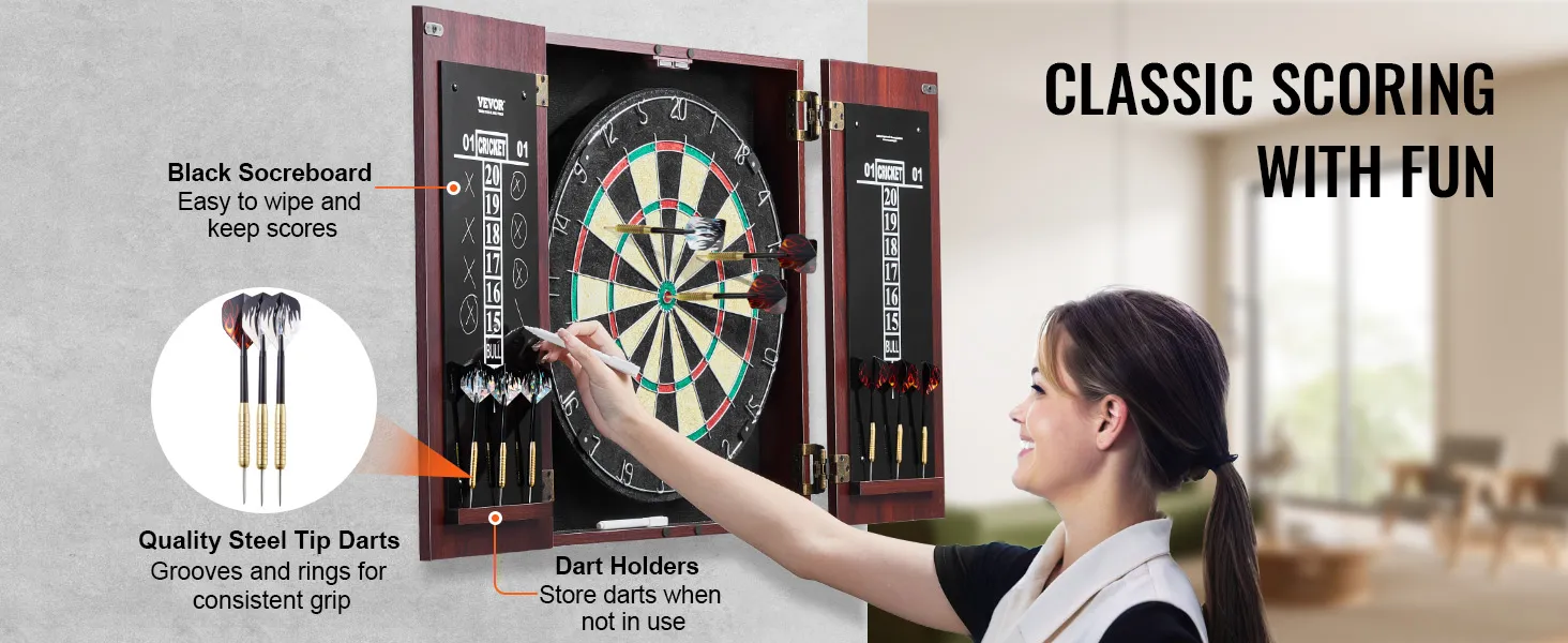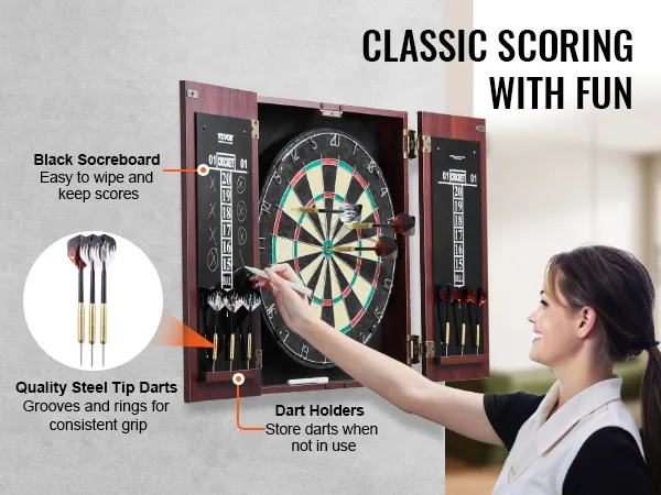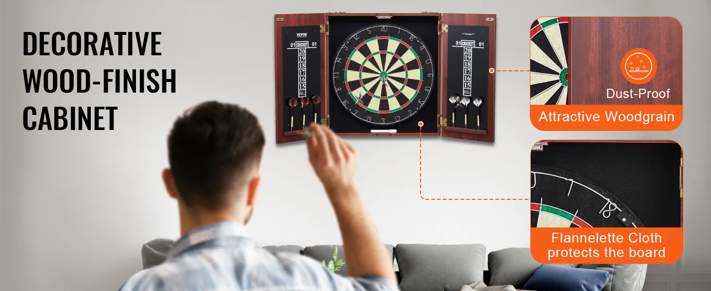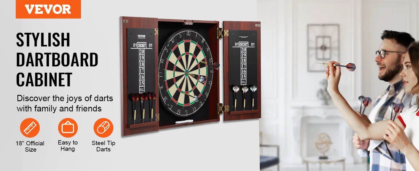 VEVOR Dartbord en Kabinetset Officiële Formaat Dartbord Kabinet, Dartbord 45 x 3,8 cm Verborgen Dartkabinet met Stalen Punten, Compleet met Alle Accessoires, voor Cricketwedstrijden