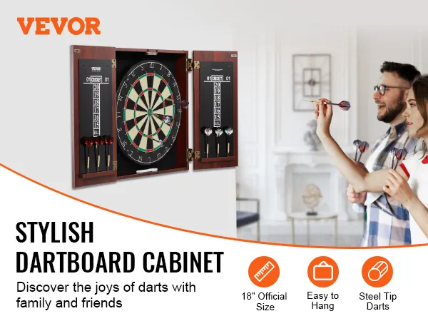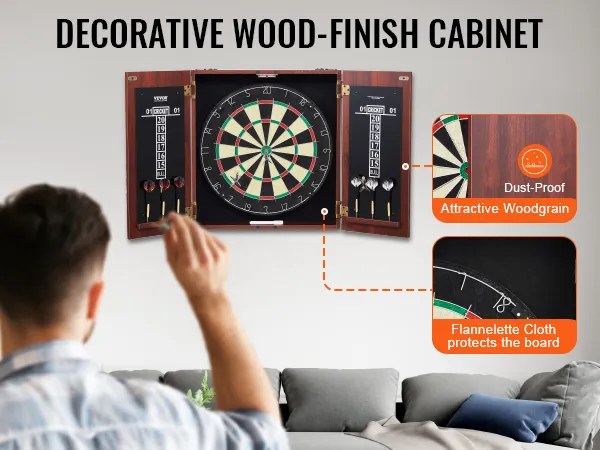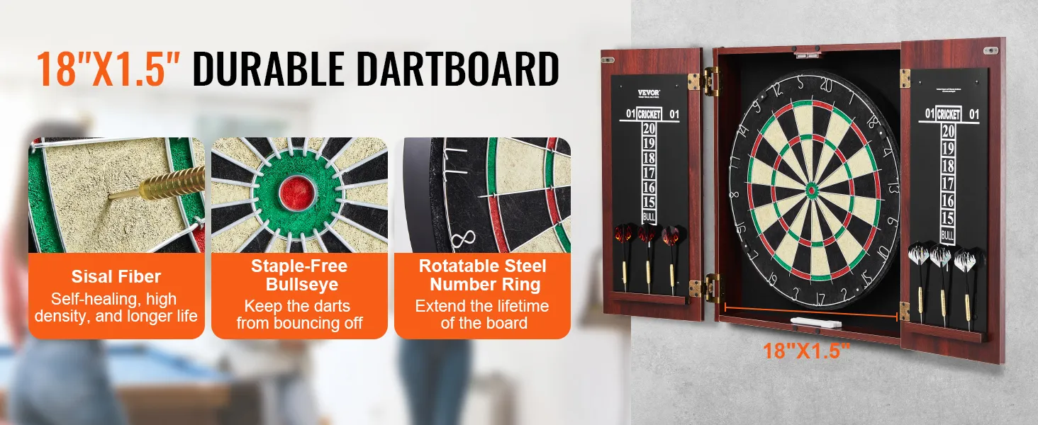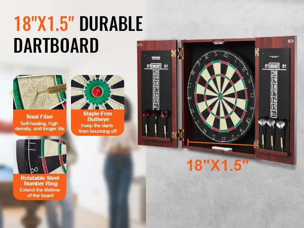 Dartbord met een diameter van 18 inch: Uitgerust met een dartbord met een diameter van 18 inch (45 cm), gemaakt van zelfherstellende sisalvezels, is deze dartbord- en kastenset ontworpen om duurzaam en langdurig te zijn. Het materiaal met hoge dichtheid en de nietjesvrije bullseye voorkomen dat darts stuiteren, terwijl de roterende stalen cijferring de levensduur van de schijf verlengt.
