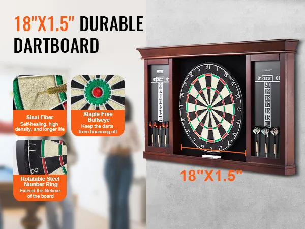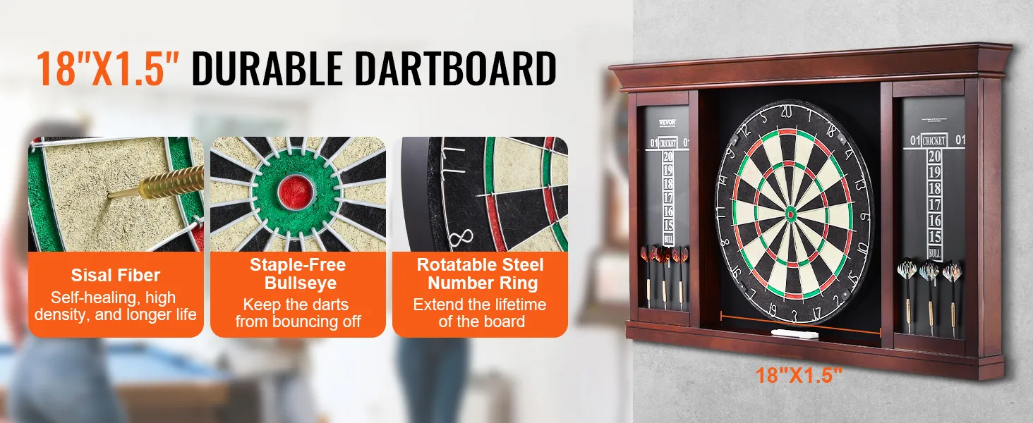 18" Diameter Dartboard: Equipped with an 18-inch diameter dartboard made from self-healing sisal fiber, this dartboard and cabinet set is designed for durability and extended use. The high-density material and staple-free bullseye prevent darts from bouncing off, while the rotatable steel number ring helps prolong the board's lifespan.