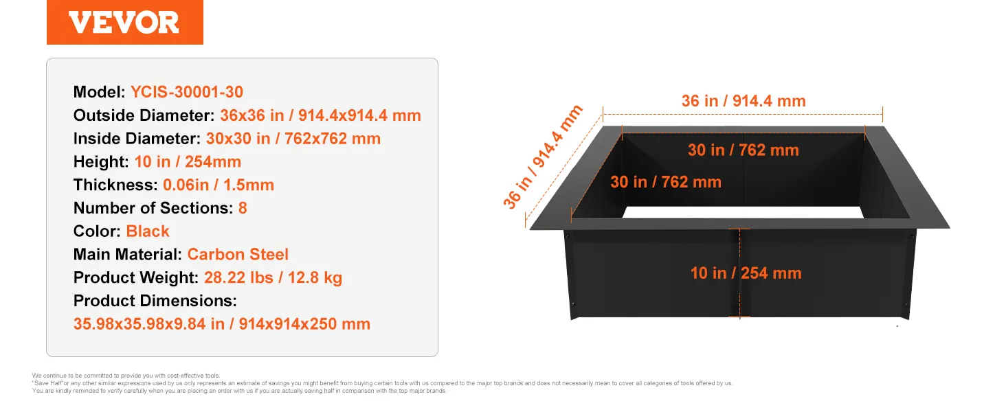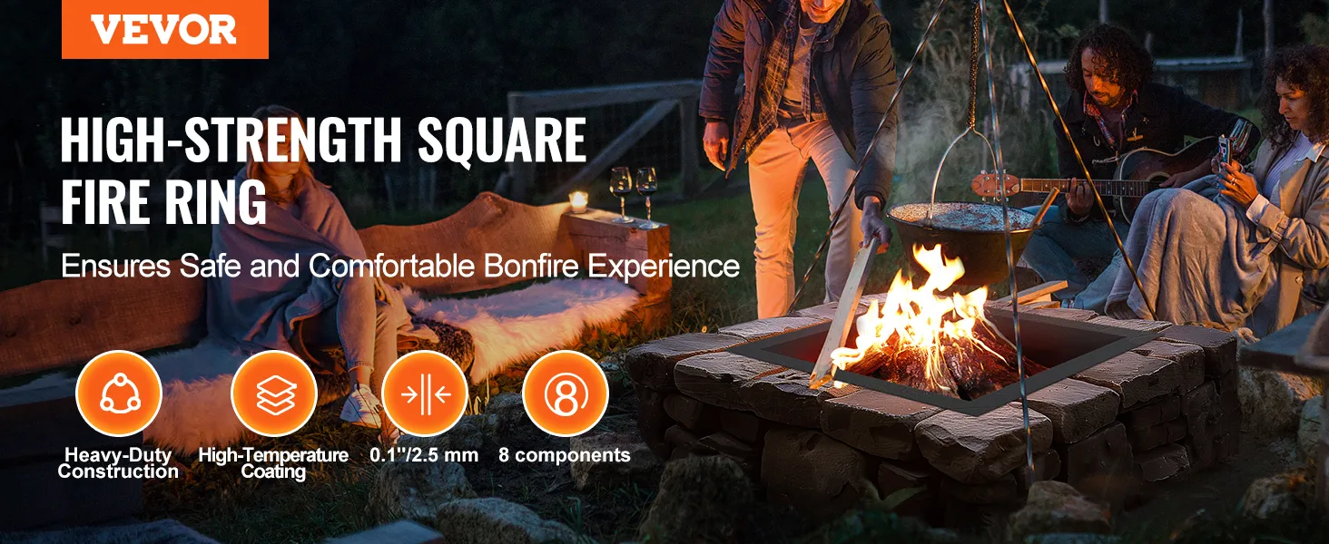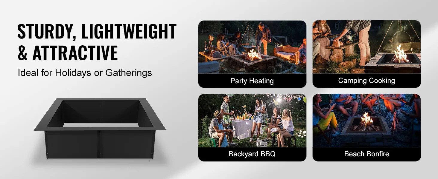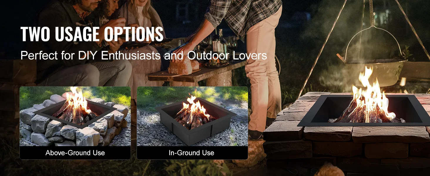 VEVOR vuurkorfring, buitendiameter 36 x 36 inch / binnendiameter 30 x 30 inch, 10 inch hoge vierkante vuurkorfvoering, robuuste koolstofstalen voering, zelfgemaakte kampvuurring boven of in de grond, voor kamperen in de buitenlucht, kampvuur