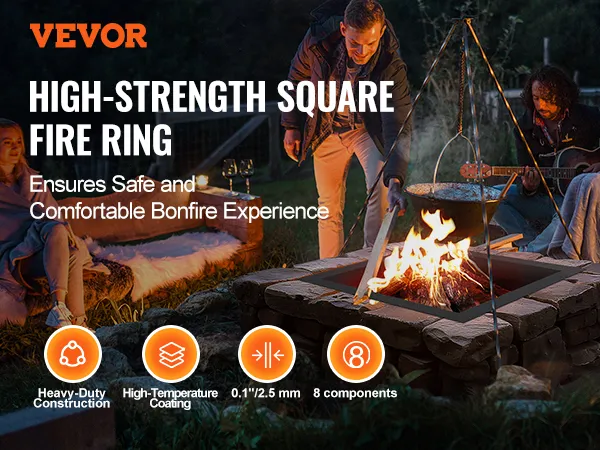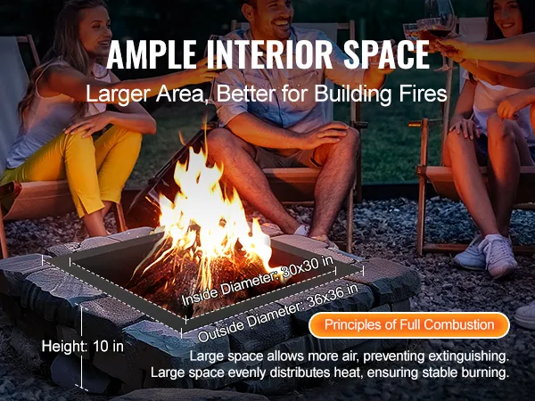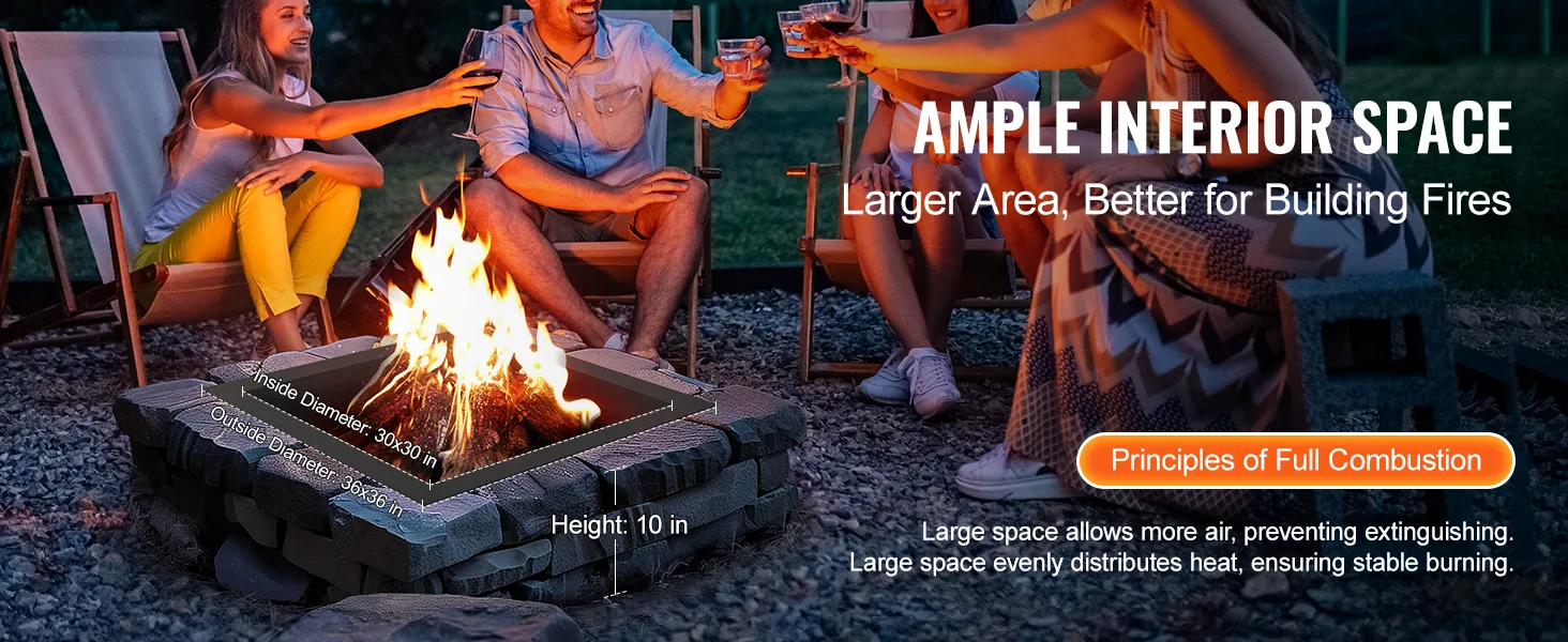 De buitenafmetingen van de vuurkorfring zijn 36 x 36 inch. De binnenafmetingen zijn 30 x 30 inch, met een hoogte van 10 inch op het hoogste punt. Deze grote maat biedt voldoende externe ruimte om meer brandhout en houtskool te herbergen. Het bevordert een betere luchtstroom om grondige verbranding te vergemakkelijken. Dit ontwerp helpt bij het effectiever aansteken van het kampvuur. U kunt genieten van langduriger vuren met minder moeite. Het ruime ontwerp maakt het perfect voor grotere bijeenkomsten.