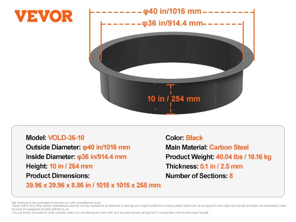VEVOR Fire Pit Ring, 40-Inch Outer/36-Inch Inner Diameter, 10inch Height 2.5mm Thick Fire Pit Insert, Heavy Duty Carbon Steel Liner DIY Campfire Ring above or In-Ground, for Outdoor Camping, Bonfires