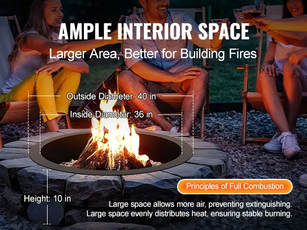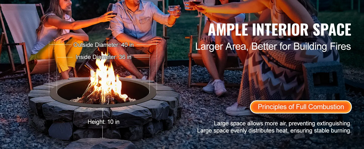 Large Size: The outer diameter is 40 inches (1016 mm), inner diameter is 36 inches (914.4 mm), height is 10 inches (254 mm), and thickness is 0.1 inches (2.5 mm), providing ample external space to accommodate more firewood and charcoal, ensuring better airflow to facilitate thorough burning and ignite the campfire.