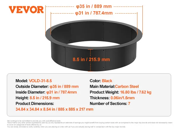 VEVOR Fire Pit Ring, 35-Inch Outer/31-Inch Inner Diameter, 10inch Height Fire Pit Insert, Heavy Duty Carbon Steel Liner DIY Campfire Ring above or In-Ground, for Outdoor Camping, Bonfires