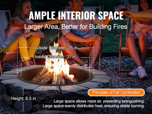 Large Size: The outer diameter is 35 inches (889 mm), inner diameter is 31 inches (787.4 mm), height is 8.5 inches (215.9 mm), and thickness is 0.06 inches (1.5 mm), providing ample external space to accommodate more firewood and charcoal, ensuring better airflow to facilitate thorough burning and ignite the campfire.