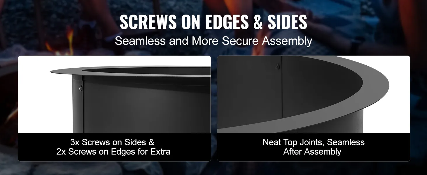 Equipped with screws around the circular fire ring's edge and sides for multiple reinforcements, ensuring stability. The top joints fit neatly and tightly together, seamless and robust, preventing loosening or deformation during use.