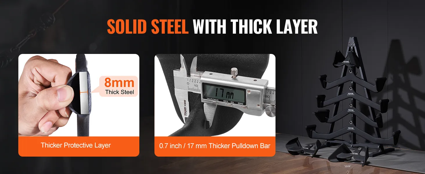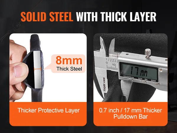 Massief stalen staaf: onze lat-pulldown-stangen zijn ontworpen met een dikke beschermlaag en een massieve stalen plaat om een lange levensduur te garanderen. De Lat Bar-set heeft een betrouwbare dikte van 17 mm (0,7 inch) op het dikste punt tot 14 mm (0,6 inch) op het dunste punt. U hoeft zich dus geen zorgen te maken over buigen of breken. Hij is stevig genoeg om zelfs de zwaarste trainingen te doorstaan.