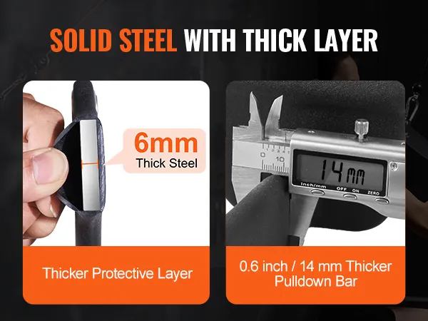Massief stalen staaf: onze trekstang is ontworpen met een dikke beschermlaag en een massieve stalen plaat om een lange levensduur te garanderen. De staaf heeft een betrouwbare dikte variërend van 0,7 inch (17 mm) op het dikste punt tot 0,6 inch (14 mm) op het dunste punt. U hoeft zich dus geen zorgen te maken over buigen of scheuren. Hij is stevig genoeg om zelfs de zwaarste trainingen te doorstaan.