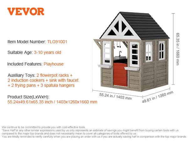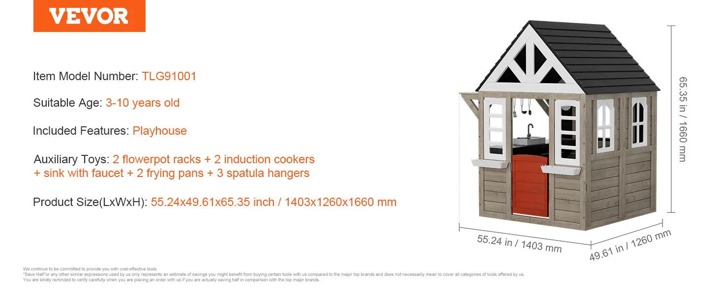 Ruime speelruimte: dit houten buitenspeelhuis biedt uw kinderen een buitenspeelruimte. Met een afmeting van 55,24 x 49,61 x 65,35 inch (1403 x 1260 x 1660 mm) is er plaats voor meerdere kinderen van 2 tot 8 jaar.