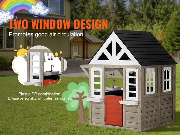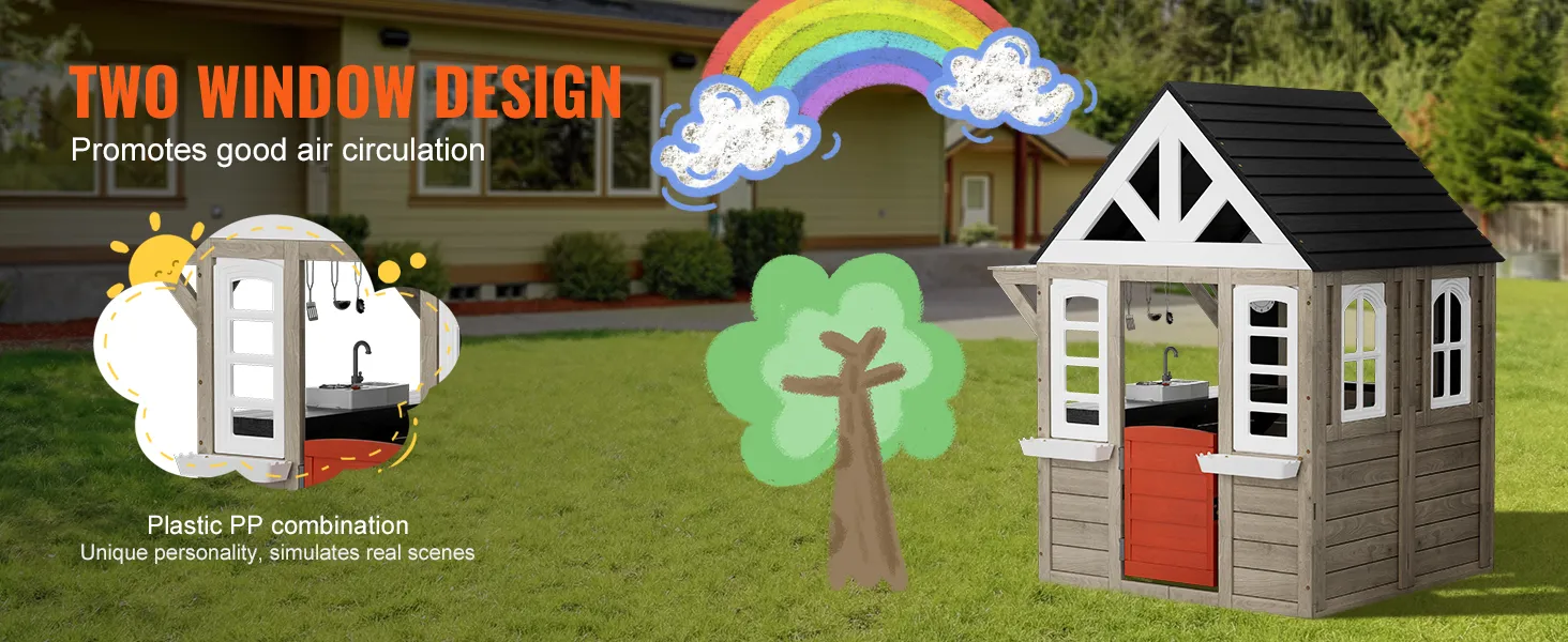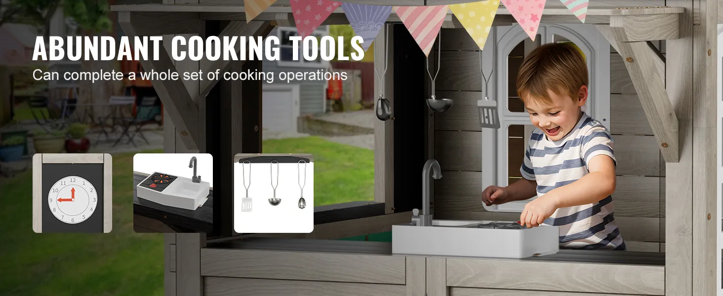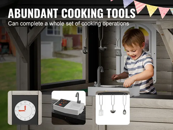 Volledig ingerichte keukenruimte: De keukenruimte binnen is uitgerust met een spoelbak met kraan, twee soorten kookgerei en spatels en lijkt op een echte keuken. In dit speelhuis kunnen kinderen kleine koks worden en het plezier van koken ervaren.