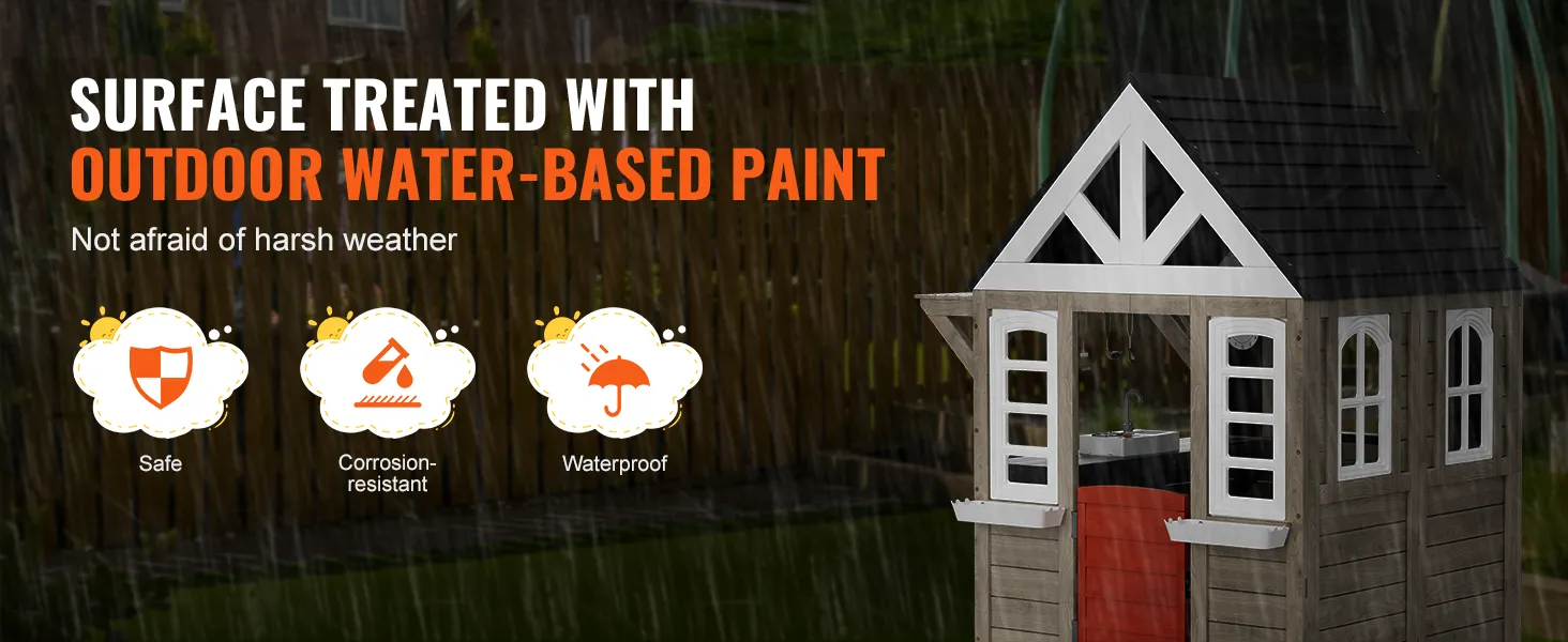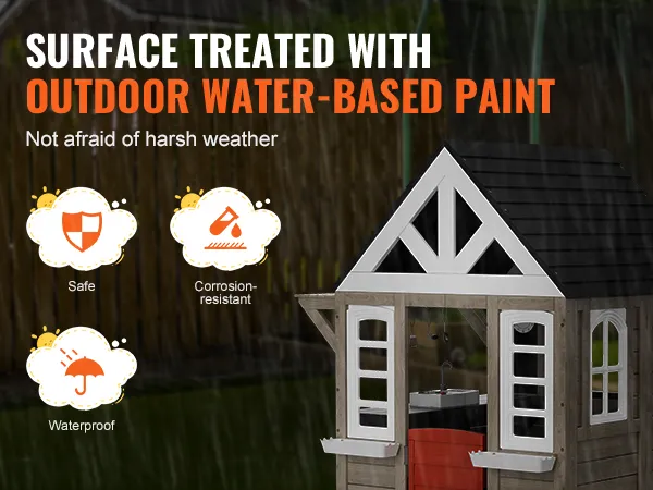 Hoogwaardige materialen: het tuinspeelhuis is gemaakt van natuurlijk cederhout, dat stevig, duurzaam, corrosiebestendig en zonbestendig is. Het houten oppervlak is behandeld met buitenverf op waterbasis en is daardoor geschikt voor gebruik onder barre weersomstandigheden.