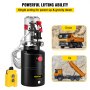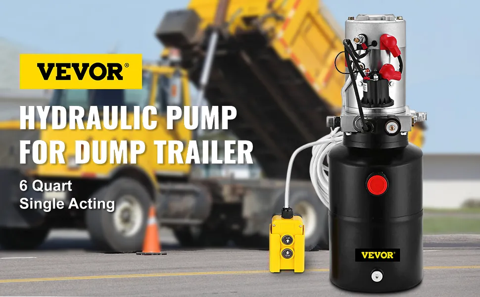 This hydraulic pump is a single-acting power unit for power up and gravity down. It has a 6-quart sturdy metal reservoir and is designed with a 12V DC motor that can provide strong power for hydraulic systems like dump trailers, forklifts, lifting platforms, etc.