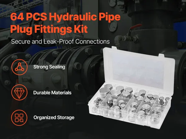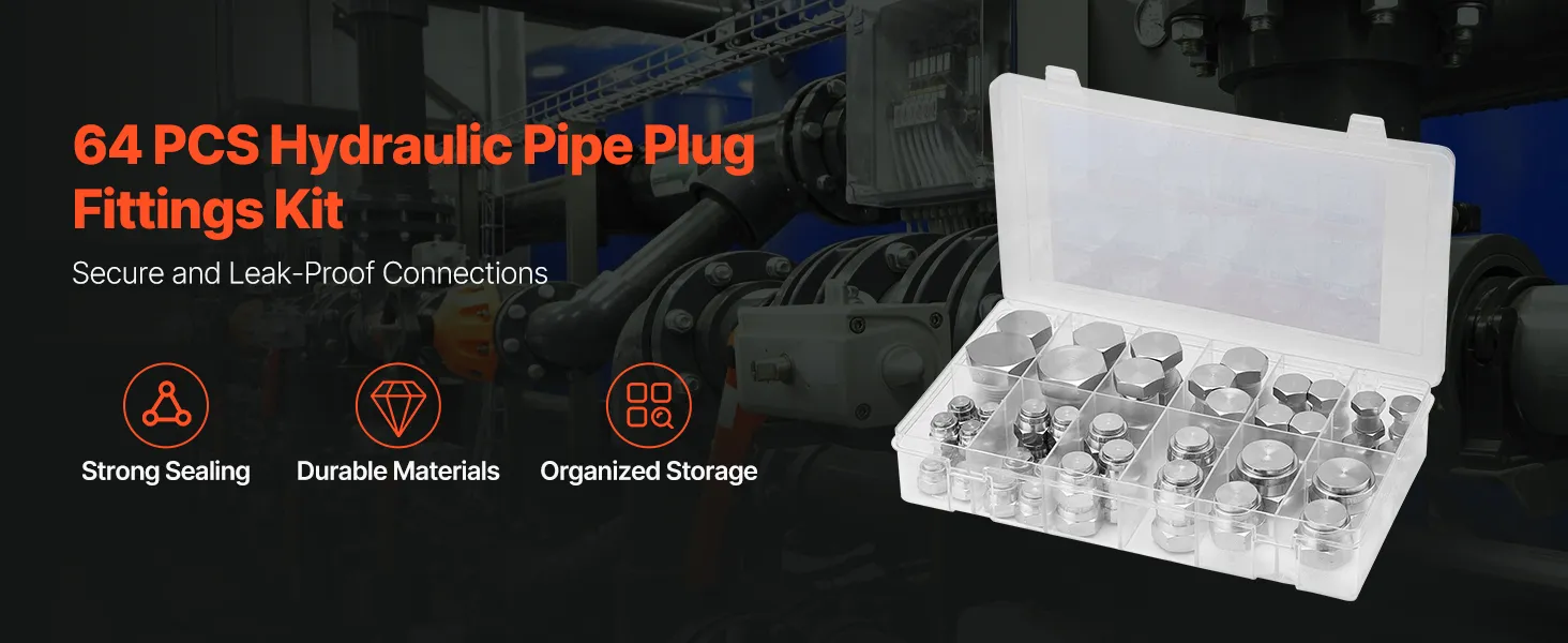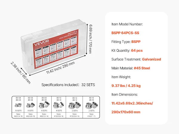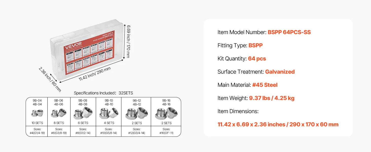 VEVOR 64 PCS BSPP Hydraulic Fittings, Hydraulic Cap and Plug Kit with Precision Threading, Galvanized Steel Heavy Duty Hydraulic Fitting Adapter Kit, Dash Sizes 04/06/08/10/12/16 VEVOR 64 PCS BSPP Hydraulic Fittings, Hydraulic Cap and Plug Kit with Precision Threading, Galvanized Steel Heavy Duty Hydraulic Fitting Adapter Kit, Dash Sizes 04/06/08/10/12/16