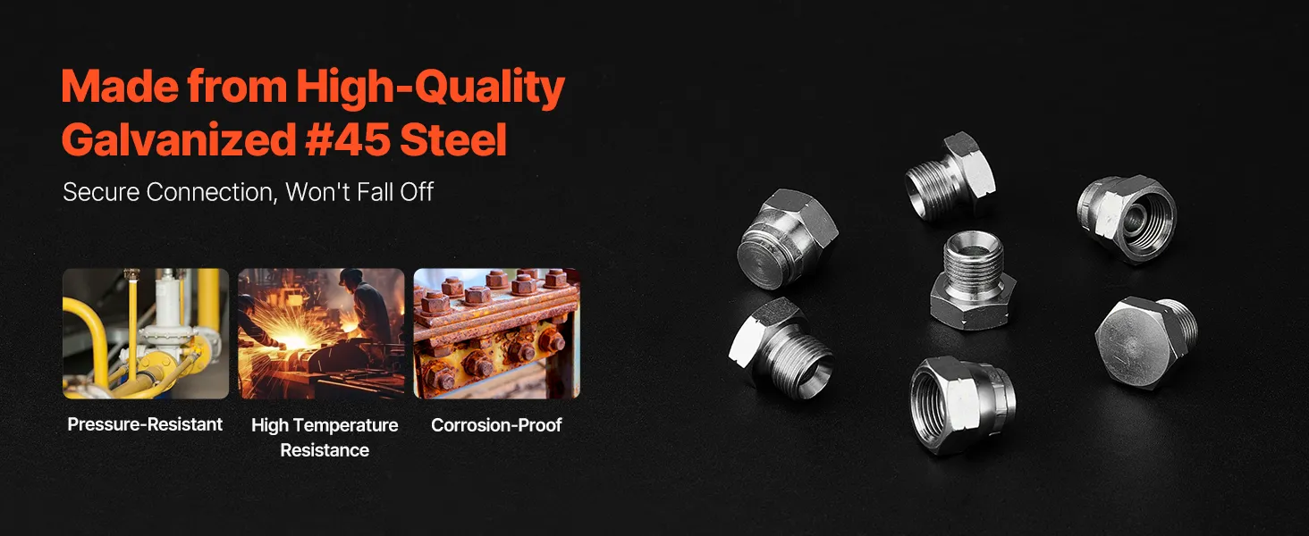 • High-Quality Materials: Our BSPP plug and cap kit is crafted from premium #45 structural steel, offering excellent tensile strength and sealing performance. The galvanized surface treatment enhances corrosion resistance, ensuring long-term reliability for use in high-pressure and high-temperature environments