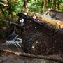 Modderige terreinwagen vast in bos, VEVOR hydraulische lier gebruikt voor berging.
