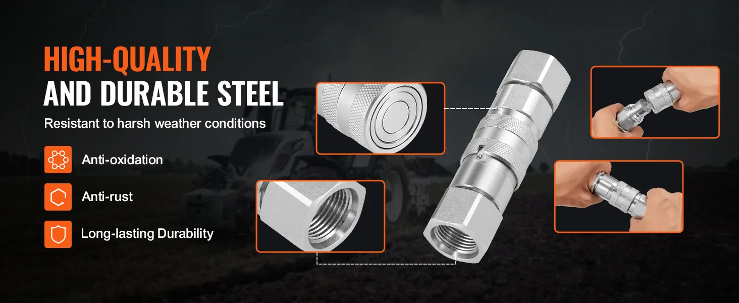 Our skid steer hydraulic couplers are made from high-quality carbon steel and coated with zinc for high rust and corrosion resistance, ensuring durability.
