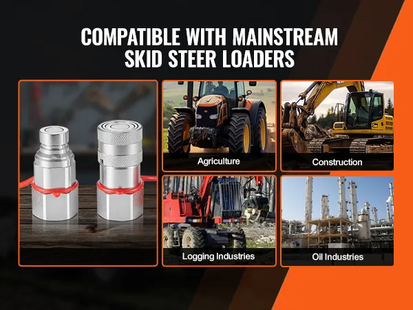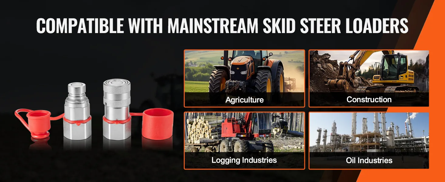 Designed for applications where hydraulic leaks may occur, the hydraulic couplings are interchangeable with most types of skid steer loaders, suitable for agriculture, construction, forestry, and more.
