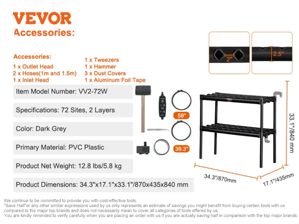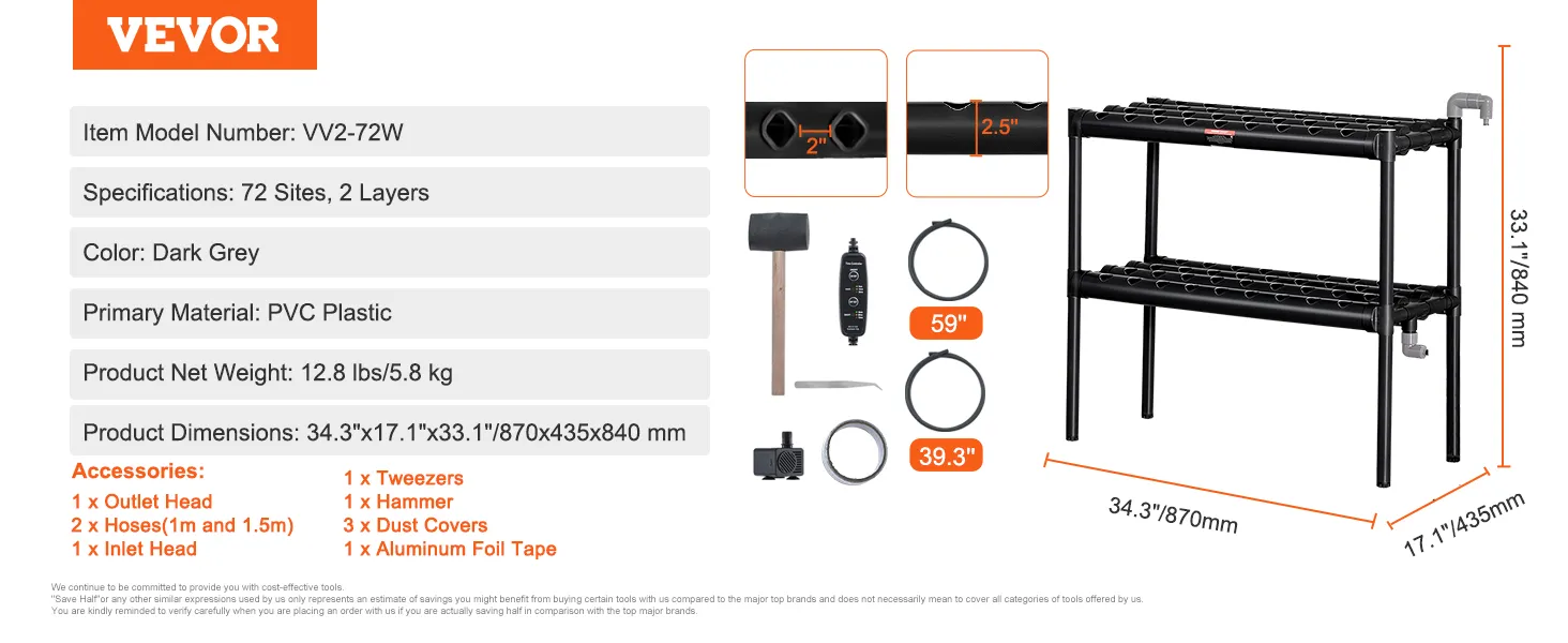 Eenvoudig te installeren en te gebruiken: ons hydrocultuursysteem omvat een set plantbuizen, een timer, een waterpomp, een slang, een uitlaatkop, een inlaatkop, 72 plantenmanden, 72 sponzen, een pincet, drie stofkappen, een rubberen hamer , een rol aluminiumtape en een handleiding voor een probleemloze installatie.