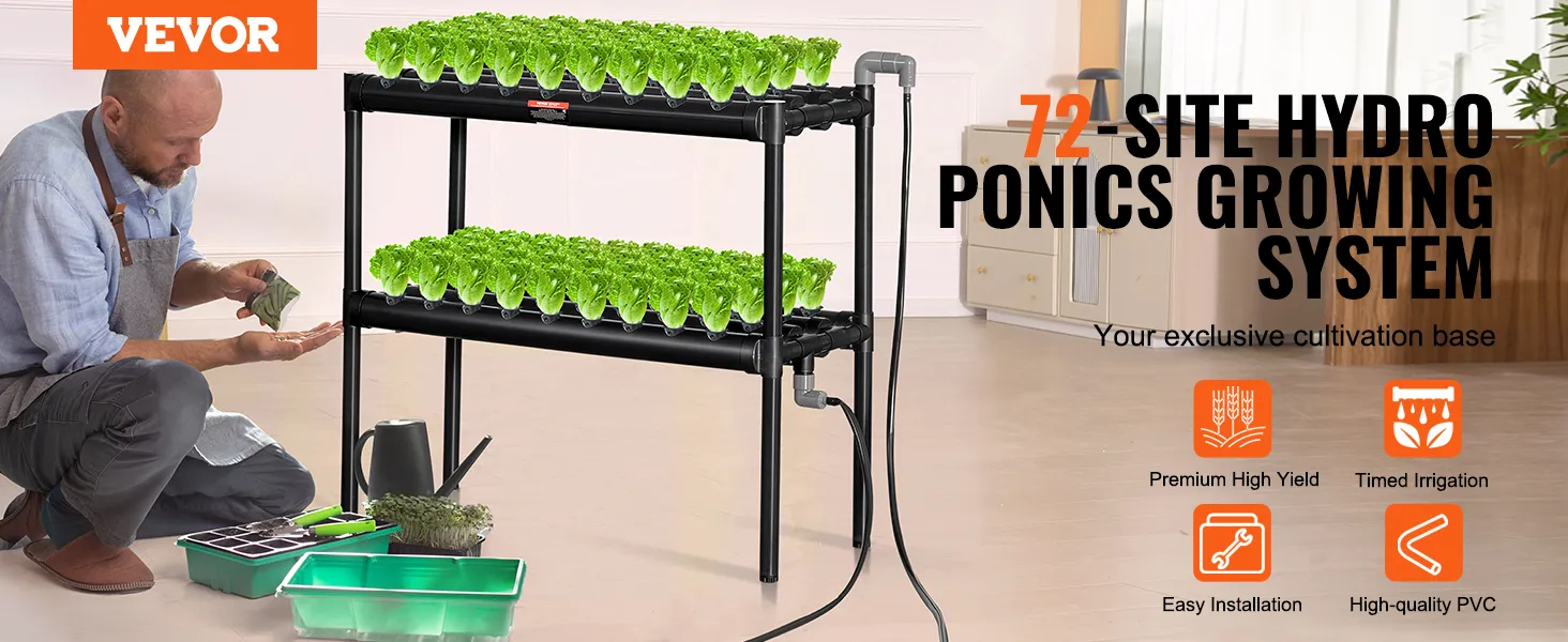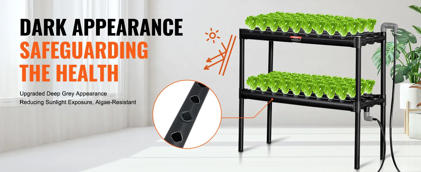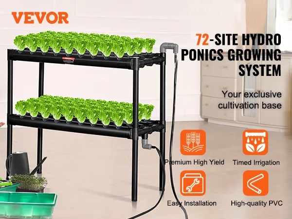 Hoge opbrengstkwaliteit: Biedt 72 locaties in 2 lagen met een buisdiameter van 2,5 inch (6,35 cm). Afstand plantplaats: 5,08 cm, diameter vierkante plantplaats: 3,2 cm. Voedingsrijke hydrocultuur bevordert een krachtige plantontwikkeling, verdubbelt de opbrengst en gebruikt minder water en ruimte dan op aarde gebaseerde methoden, waardoor een schone kweekomgeving wordt gegarandeerd.
