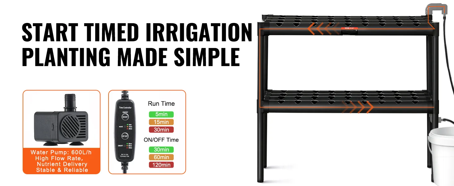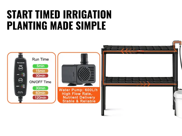 Getimed irrigatiesysteem: Dit hydrocultuursysteem beschikt over een pomp van 7 W met instelbare stroom en een timer voor optimale watercirculatie. Het bevat een 24-uurs plug-in timer waarmee u eenvoudig en zonder toezicht bedrijfscycli kunt instellen, wat het gebruiksgemak vergroot. Aanbevolen voor gebruik met een watercontainer van 20 liter (niet inbegrepen).
