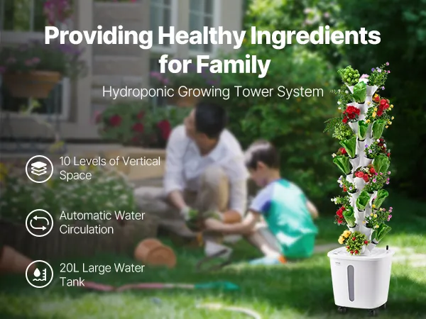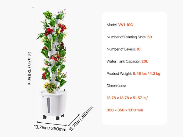 This 10-tier hydroponic tower is made of PP material, ideal for vegetable and flowers. The 20L water tank and water circulation ensures healthy plant growth. With an intelligent socket for precise control over light and water pump timings, setup is easy and soil-free for creating your dream garden.