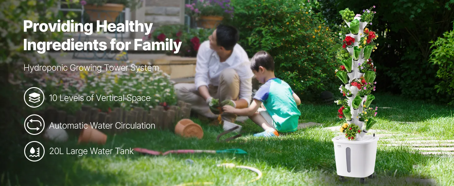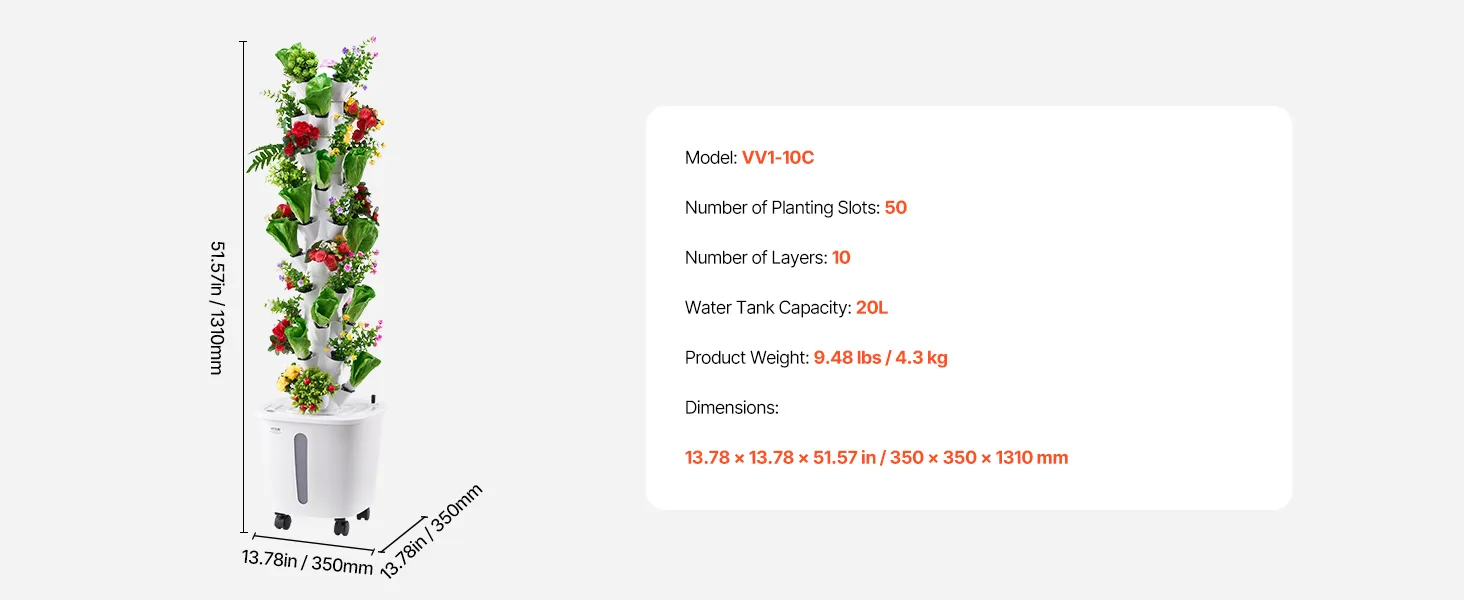 Space-Saving, Efficient Growing: With a 10-tier vertical design and 50 planting slots, this hydroponic tower measures just 13.78 x 13.78 x 51.57 inches. Ideal for kitchens, balconies, and small apartments, it allows you to grow efficiently in limited spaces while enjoying a green lifestyle.