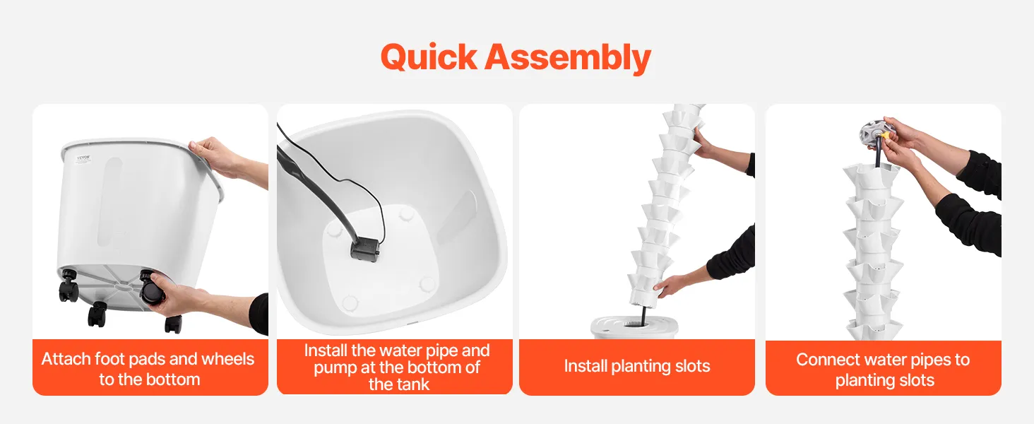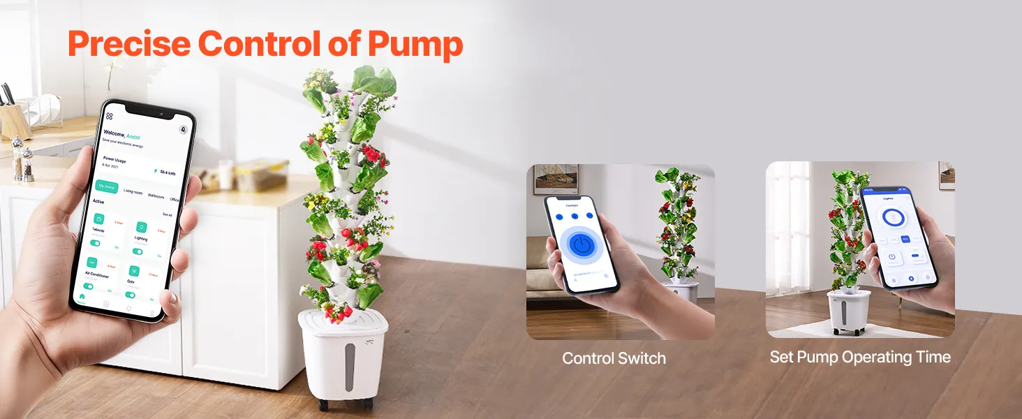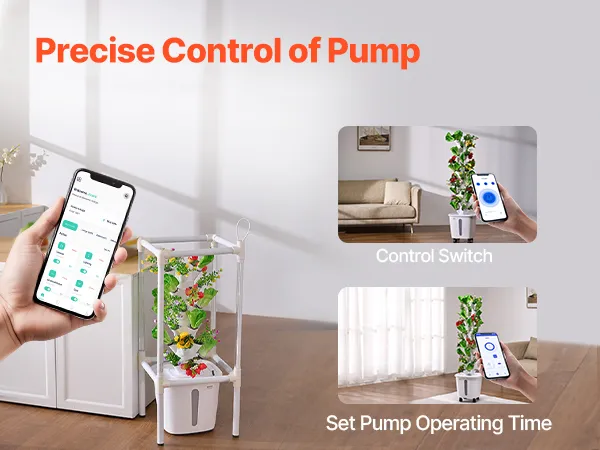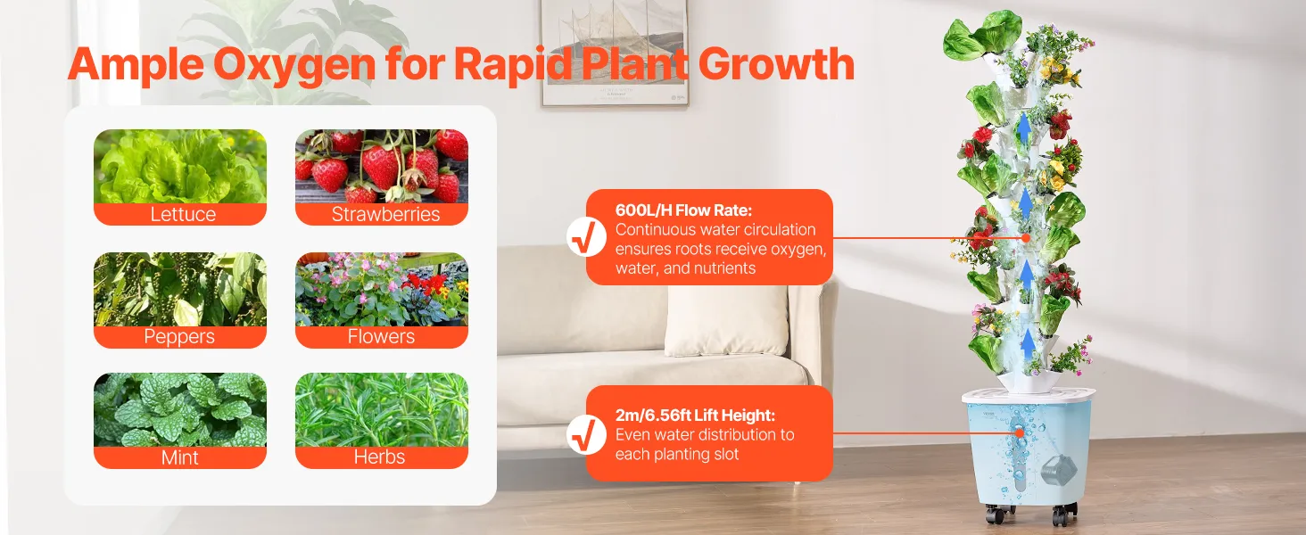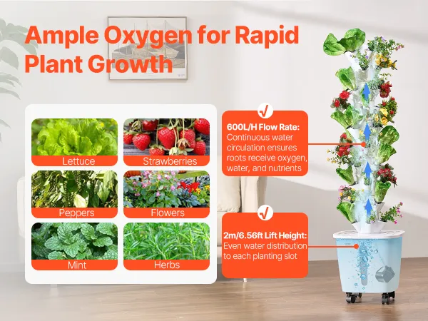 With a flow rate of 600L/H, this hydroponic tower provides ample oxygen to plant roots, promoting healthy growth. The 2m/6.56ft lift height ensures even water distribution to every planting pod, helping plants thrive in an oxygen-rich environment.