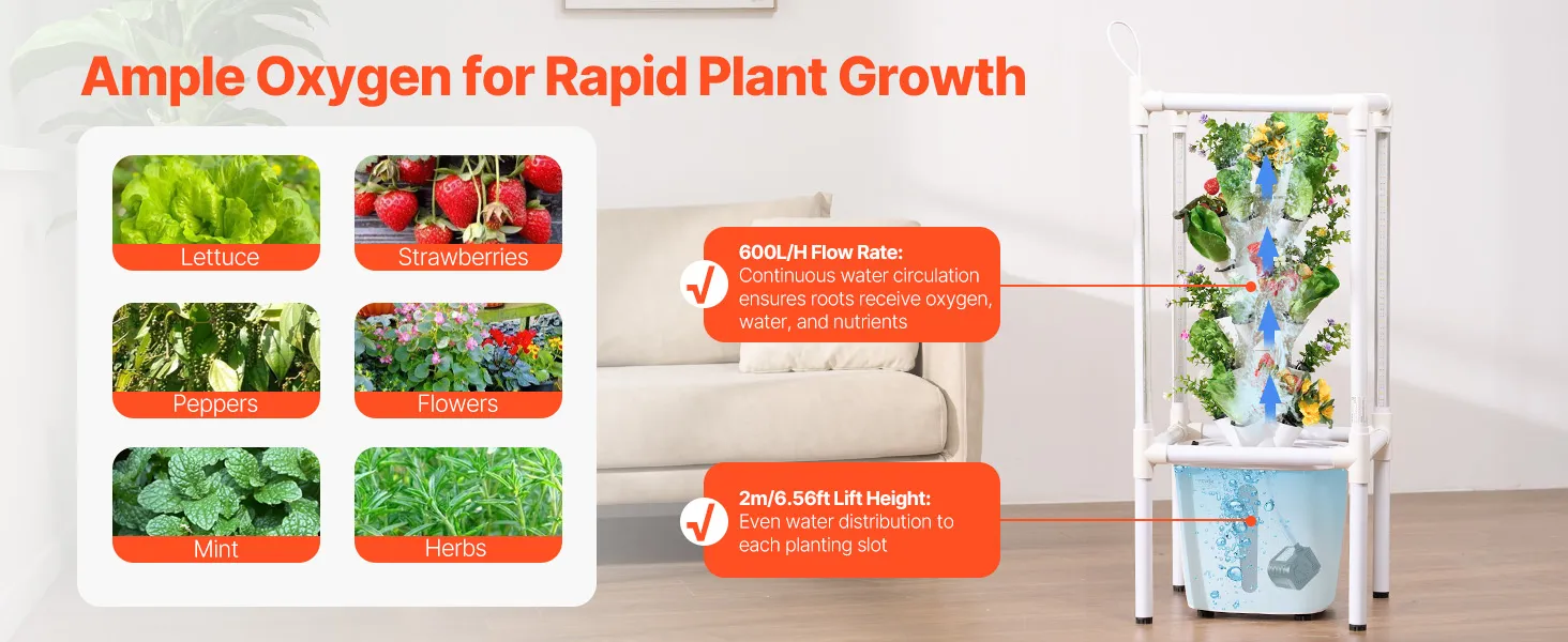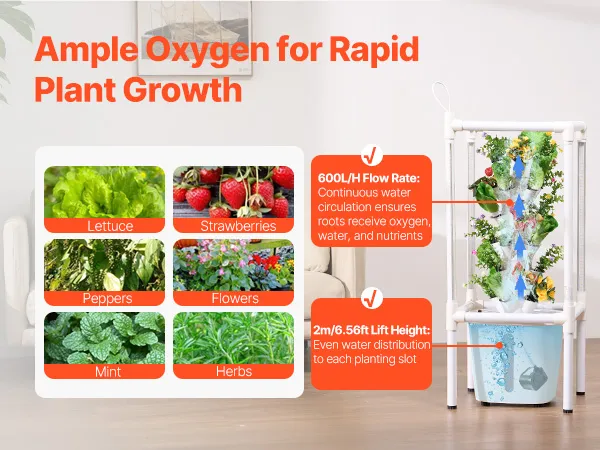 With a flow rate of 600L/H, this hydroponic tower provides ample oxygen to plant roots, promoting healthy growth. The 2m/6.56ft lift height ensures even water distribution to every planting pod, helping plants thrive in an oxygen-rich environment.