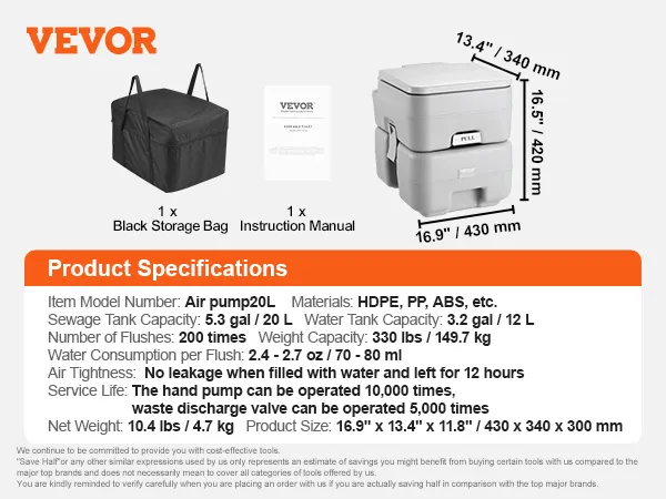 VEVOR Portable Toilet for Camping, Porta Potty with Carry Bag, 5.3 Gal Waste Tank & 3.2 Gal Flush Tank, Push-Button Pressurized Flush Commode, Leak-proof and Odourless Travel Toilet for Camping Car
