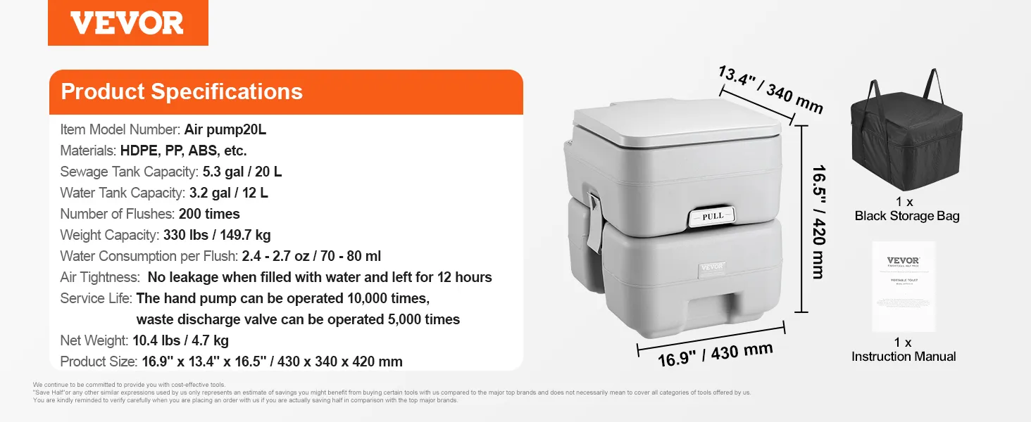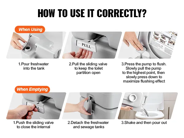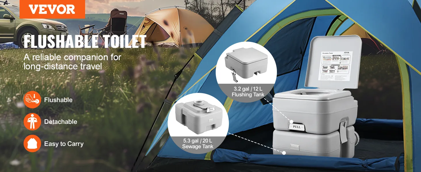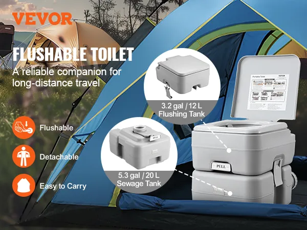 The portable toilet has a large capacity waste tank of 5.3 gal / 20 L with flushing function, perfect for long-distance travel, suitable for use in RVs, boats, trucks, outdoor camping, road trips, etc.