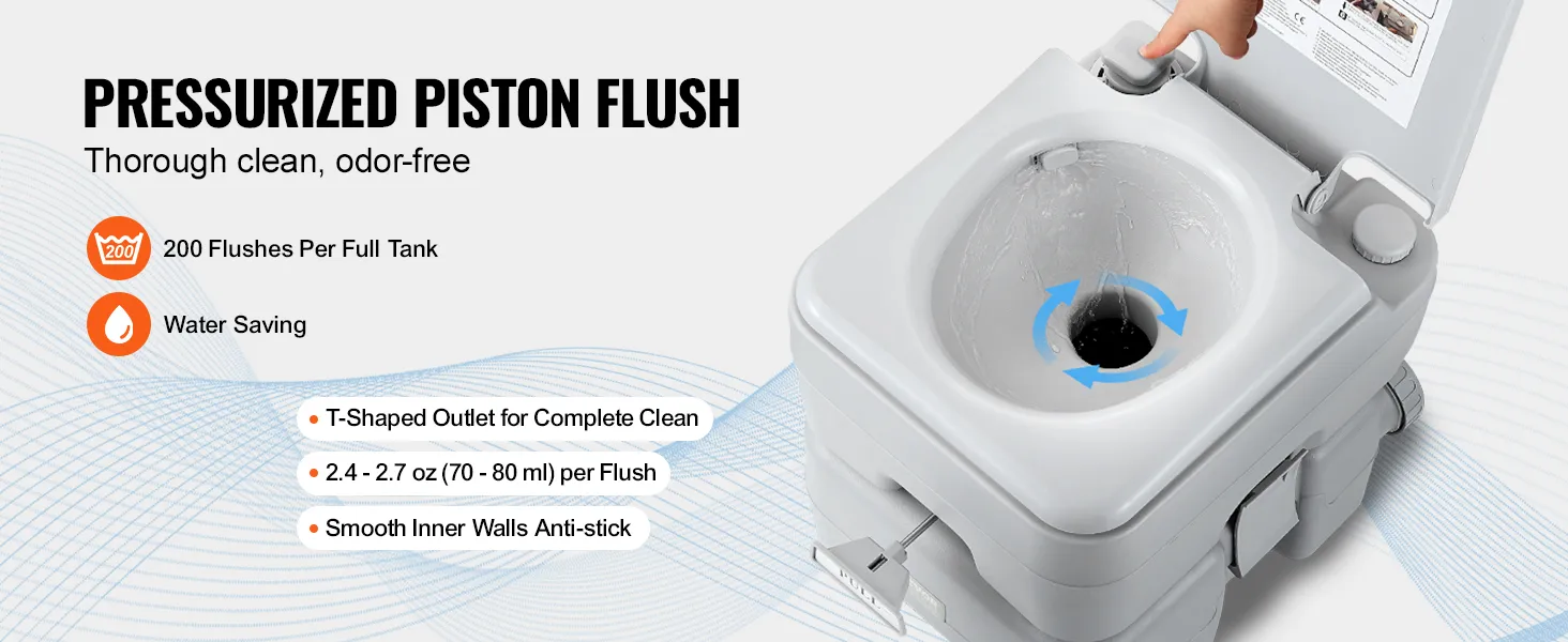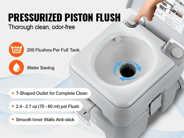Pressurized Flushing with up to 200 Uses: The 3.2 gal / 12 L flush tank features a manual piston pump for pressurized flushing, providing up to 200 flushes per fill, saving water with no need for frequent refills. With a T-shaped full-coverage outlet design, it ensures quick and thorough cleaning from every angle. The waste tank's interior walls are made of easy-to-clean and highly durable materials to prevent waste buildup.
