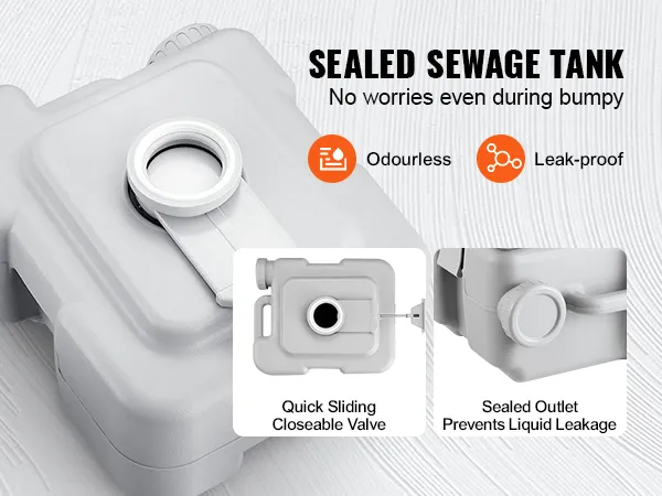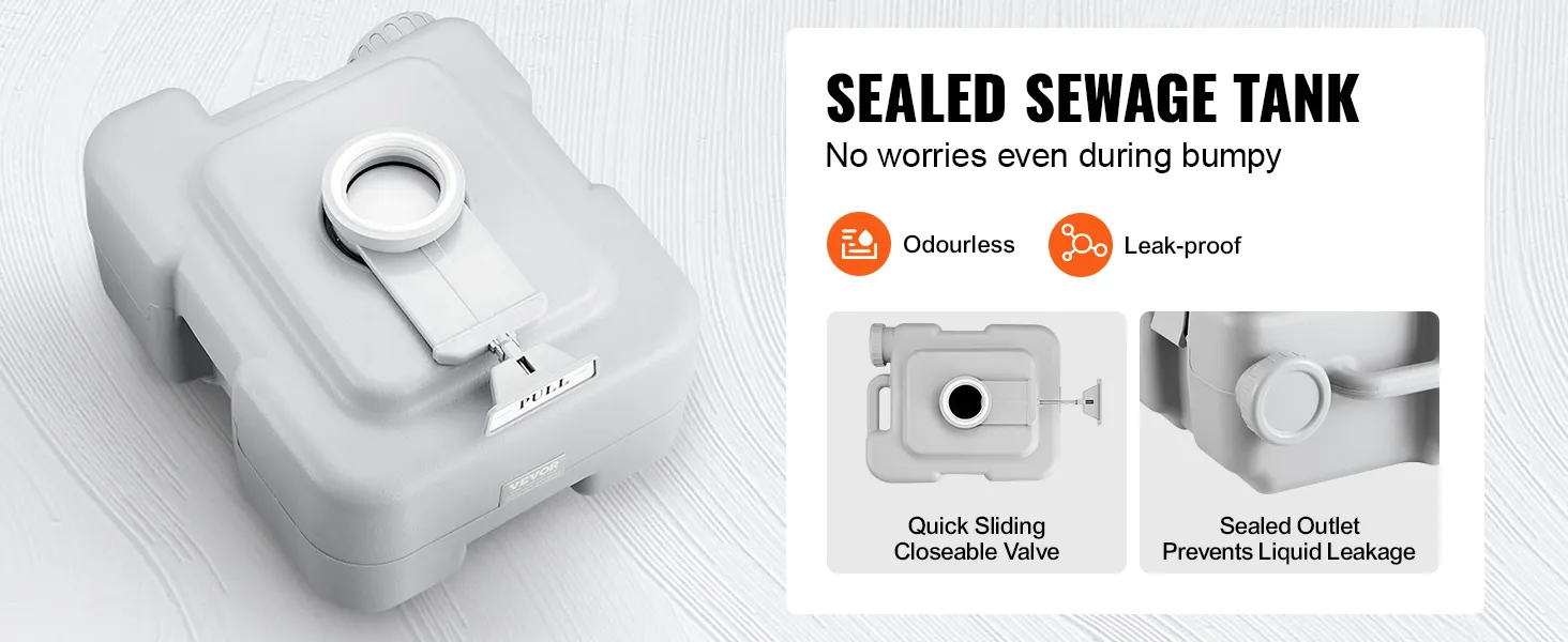 Leak-proof & Odor-reducing: The sliding seal discharge valve at the top of the 5.3 gal / 20 L sewage tank, along with a sealing ring at the discharge outlet, ensures excellent sealing, even after 12 hours of full water immersion, preventing leaks during bumpy travels and reducing everyday odors.