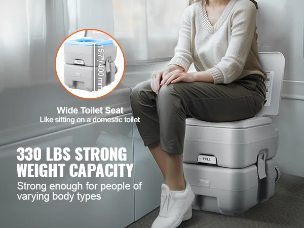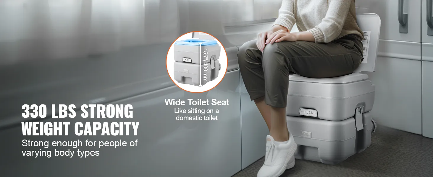 Flushable & Detachable: No more frantic searches for the nearest restroom while camping or traveling! This toilet comes with detachable waste and flush tanks. Once securely fixed in place, its stable structure can support up to 330 lbs / 149.7 kg without deformation, ensuring a comfortable experience without collapsing or deforming. With an ergonomic height of 15.7" / 400 mm, it is suitable for pregnant women, children, and the elderly.