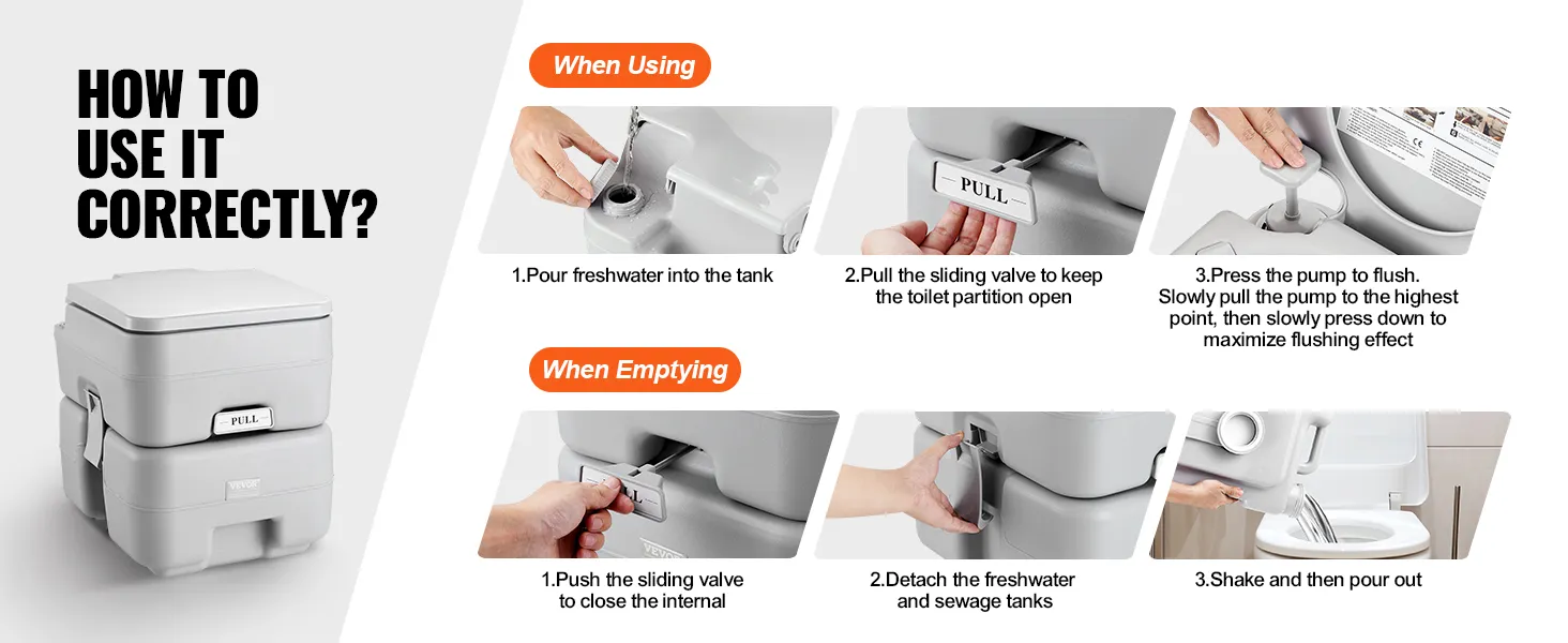 Easy to Empty and Clean: Featuring a straight discharge outlet design, there's no need for extra complicated operations—just add water, shake, and pour out the waste directly. The toilet seat and lid can be individually removed for easy cleaning.
