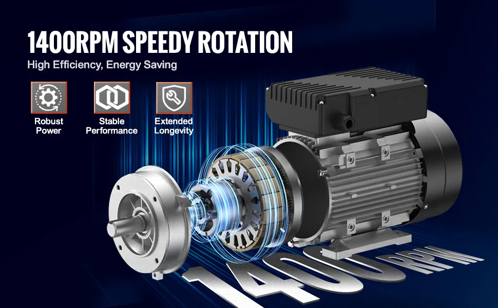 De elektromotor van 0,75 kW van VEVOR biedt een hoog toerental van 1400 tpm en levert sterke prestaties voor diverse toepassingen. Het robuuste uitgangsvermogen maakt hem ideaal voor landbouwmachines en industriële installaties, waardoor energie wordt bespaard en de productiviteit wordt verhoogd.