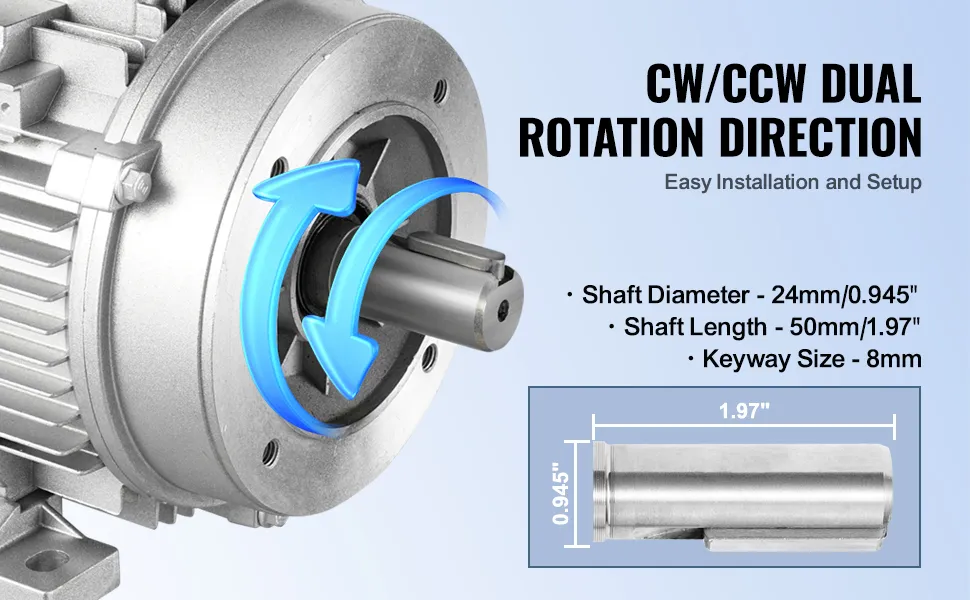 Dubbele rotatierichting: onze elektromotor biedt omkeerbare rechts-/linksrotatie, waardoor de bedrading wordt vereenvoudigd en snelle, veelzijdige verbindingen voor verschillende toepassingen mogelijk zijn.