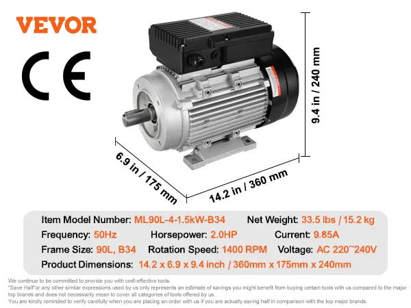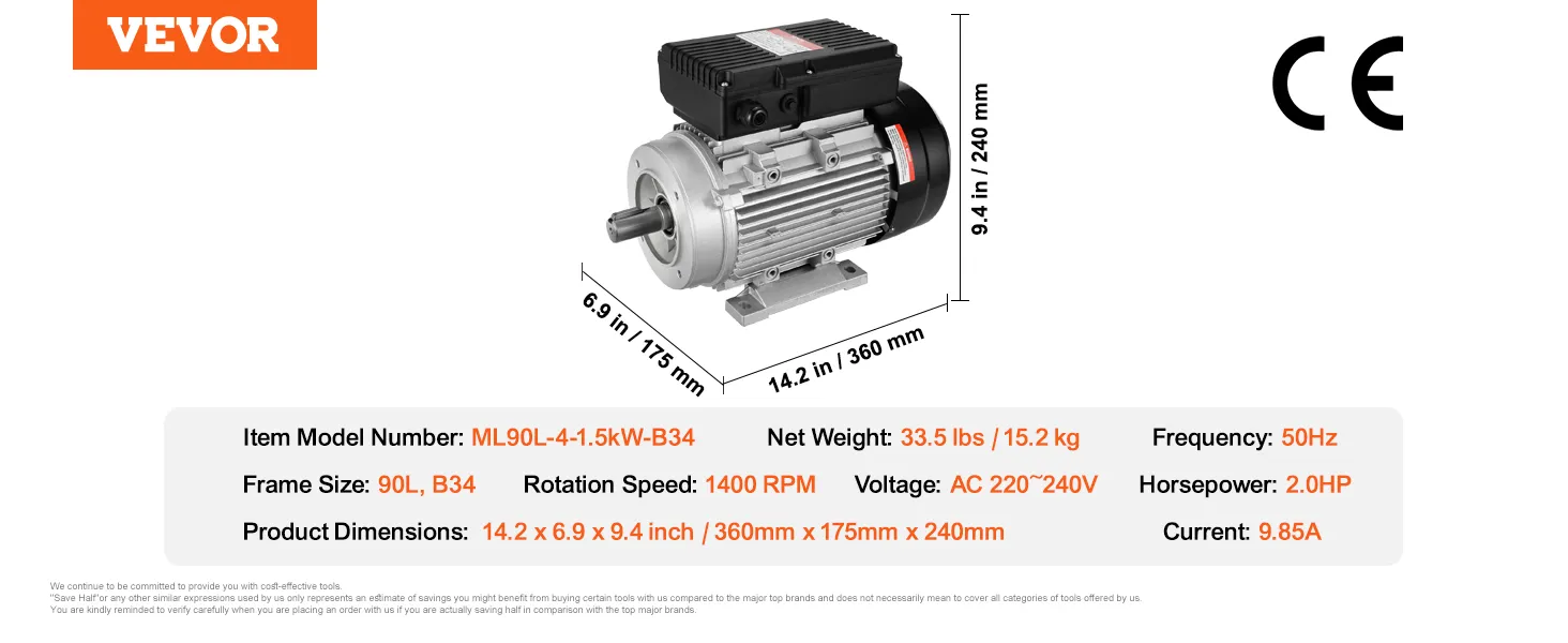 Inject powerful performance into your equipment with the VEVOR 1.5KW electric motor. Operating at AC 220~240V voltage with 9.85A current, it features 1400 RPM high speed, 90L, B34 frame, 50mm shaft length, 24mm keyed shaft, and CW/CCW dual rotation direction.
