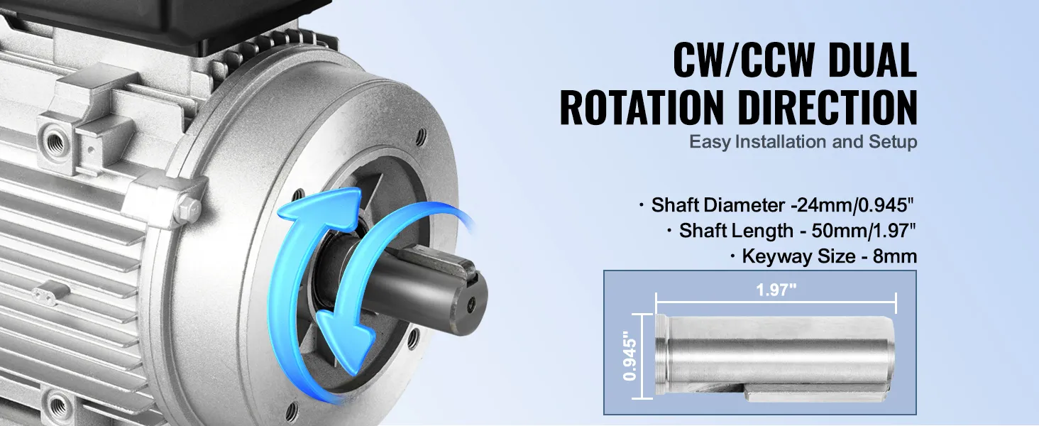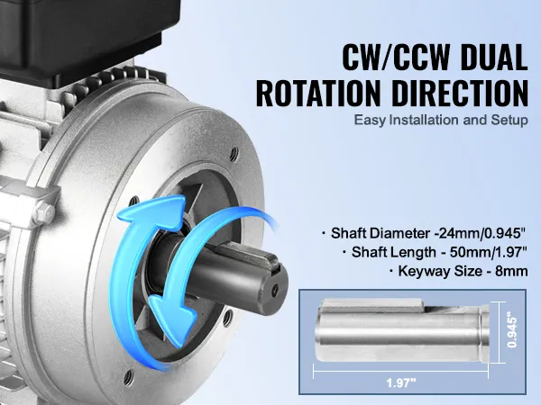 Dual Rotation Direction: Our electric motor offers reversible CW/CCW rotation, simplifying wiring installation and providing quick, versatile connections for various applications.