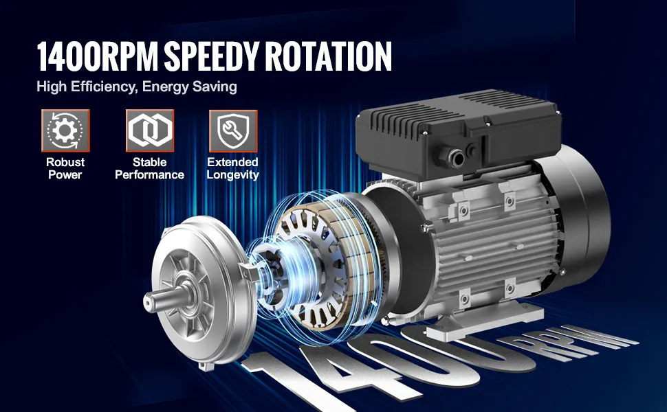 De 1,5 kW elektromotor van VEVOR biedt een hoog toerental van 1400 tpm en levert sterke prestaties voor diverse toepassingen. Het robuuste uitgangsvermogen maakt hem ideaal voor landbouwmachines en industriële installaties, waardoor energie wordt bespaard en de productiviteit wordt verhoogd.